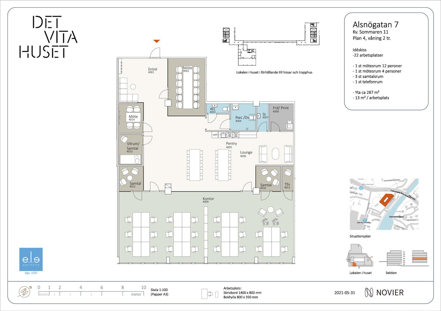 Går att hyra för 1 500 kr/plats/månad. Kvot: 1 plats per ca 150 kvm hyrd yta.