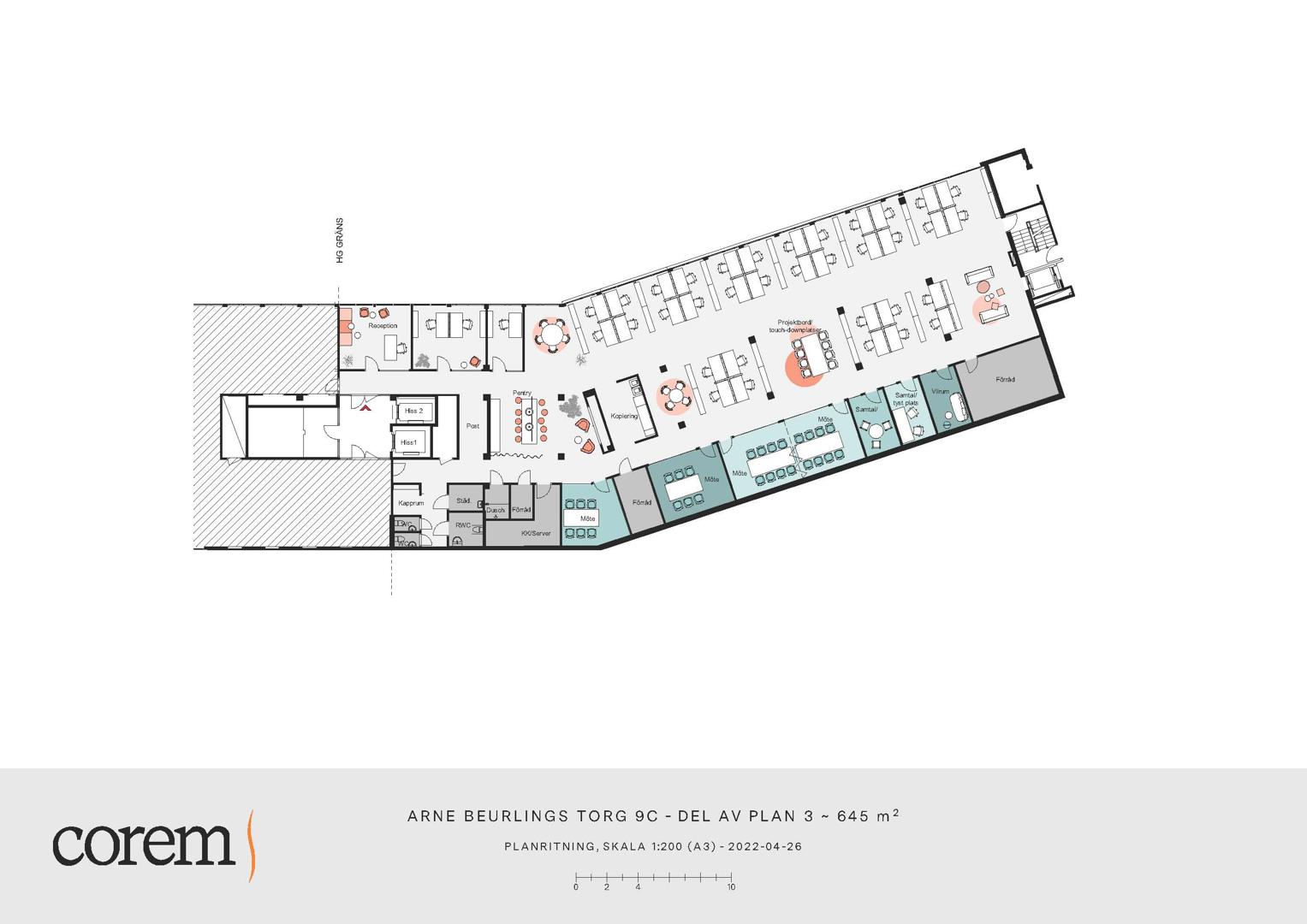 Här återfinns en ljus och modern kontorslokal med utmärkt kommunikationsläge. Lokalen har en öppen planlösning kompletterad med ett fåtal separata kontorsrum samt flera mötesrum. Stora fönster ger rikligt ljusinsläpp och utsikt över Arne Beurlings Torg – Kistas nya knutpunkt där tvärbanan kommer att ansluta området med Helenelund och Bromma.