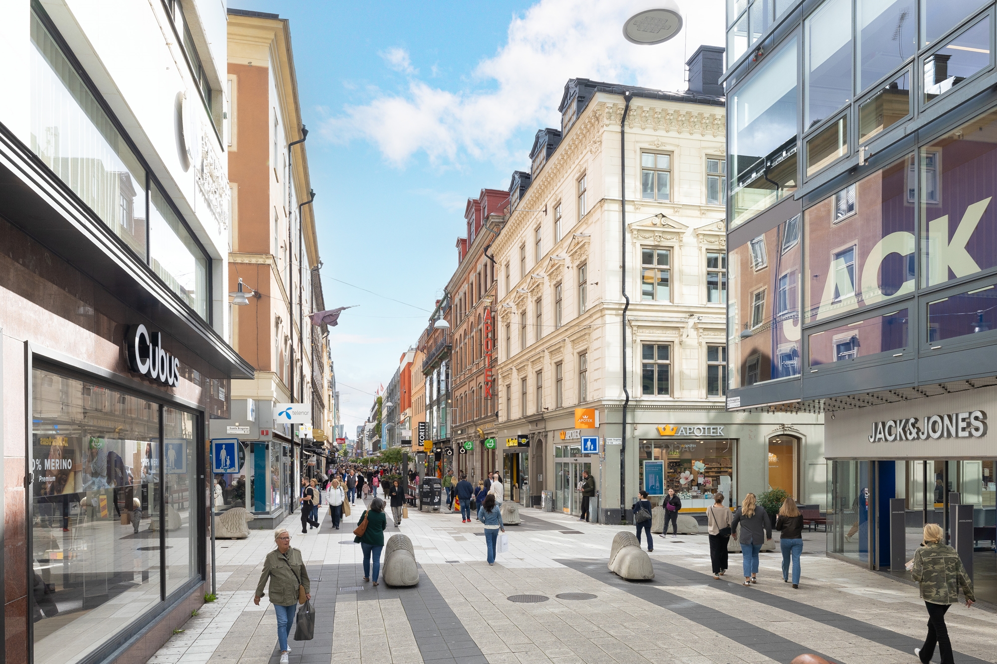 Drottninggatan i centrala Stockholm är en välbesökt gata som erbjuder ett mångsidigt utbud av shopping och nöjen. Den innehåller en blandning av internationella kedjor och små lokala butiker, vilket ger besökare en bred variation av shoppingalternativ. Förutom butiker finns det fleratalet olika caféer och restauranger. Gatan är också hem för olika kulturella platser, inklusive gallerier och teatrar. Om somrarna blir vissa delar av Drottninggatan gågator, vilket bidrar till en dynamisk och trivsam atmosfär med uteserveringar och gatuartister.