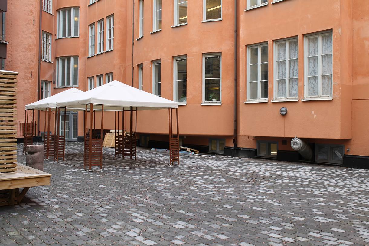 Fastigheten har en terrass som är belägen högst upp i huset samt en innergård som får nyttjas av alla hyresgäster i fastigheten.