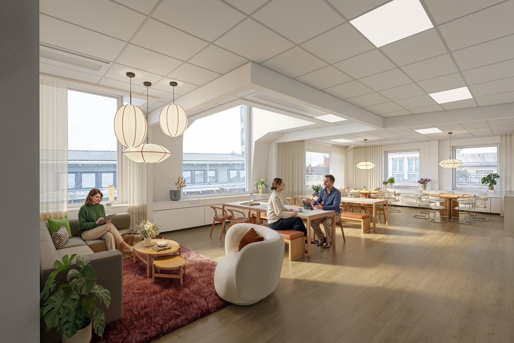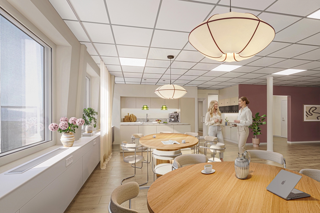 Pentryytan är rymlig och flexibel, med gott om plats för matbord, soffgrupper och sociala möbler, en naturlig samlingspunkt för lunch, möten eller spontana samtal.