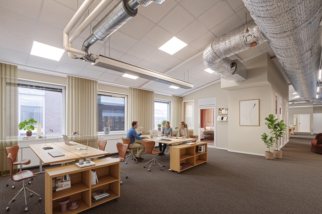 Det öppna landskapet är stort och luftigt, med generösa takhöjder som ger en unik känsla av rymd och industriell karaktär. Här finns även två separata kontor samt flera stödfunktioner såsom telefon- och teamsrum, vilket skapar en balans mellan öppet samarbete och avskild arbetsro.