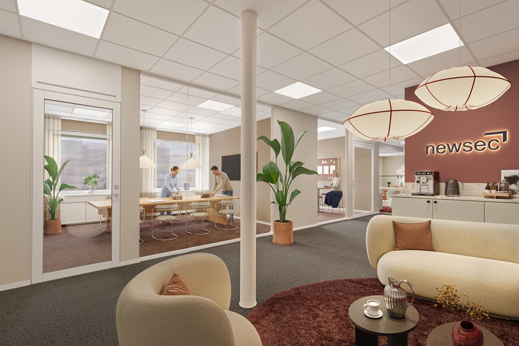 Entrén ger ett varmt och professionellt första intryck med plats för loungegrupper, här finns också en utmärkt möjlighet att profilera ert varumärke, exempelvis genom att placera er logotyp på ett tydligt och stilfullt sätt som syns direkt när besökare kommer in.