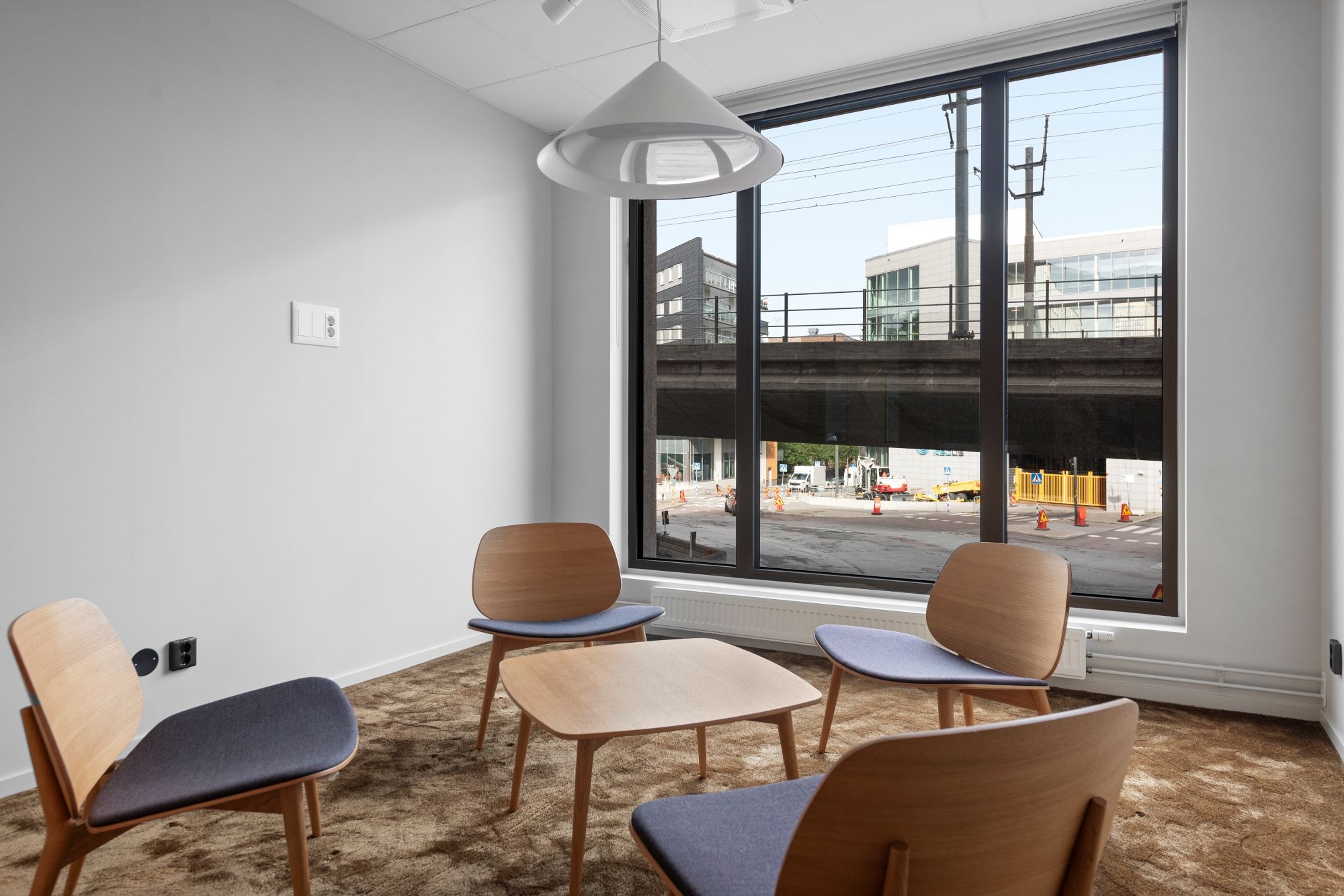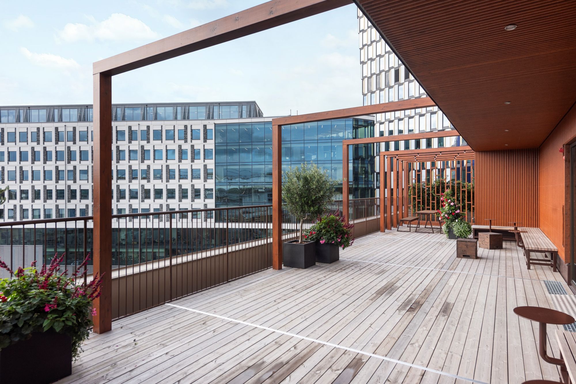 Njut på takterrassen under eller efter arbetsdagen med en utsikt över Hammarby Sjöstad.