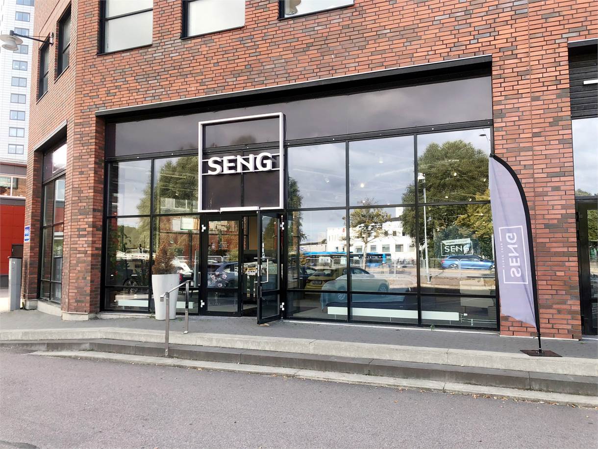 Hörnbutik på bottenvåningen med stora skyltfönster mot knutpunkt Hjalmar, "Gamla Bultfabriken", Herkulesgatan 1V, Göteborg.