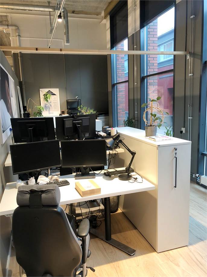 Planlösningen består av en stor butik, lager med stor port för lossning och lastning, ett lite större kontorsrum och ett mindre kontorsrum (med översikt över butiken), kundtoalett, städ, personalutrymme med kök, toalett, omklädningsrum och dusch.