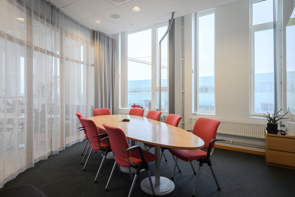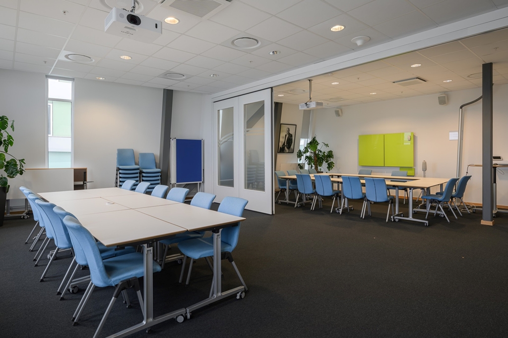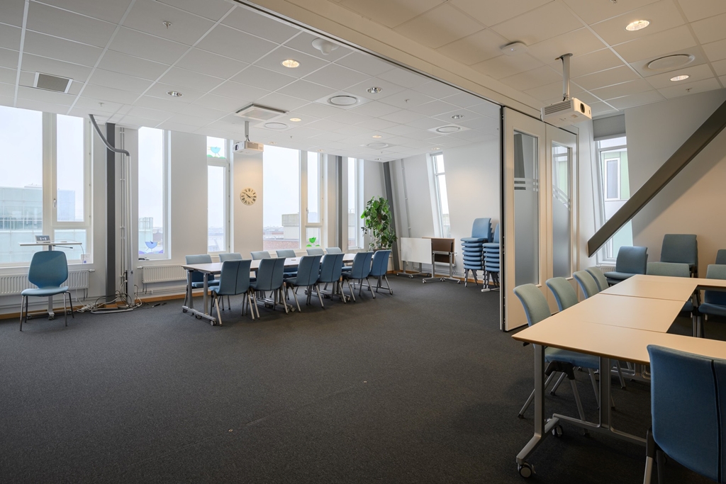 Här finns även ett konferensrum som är delbart med en praktiskt vikvägg. Allt för att optimera ytan vid olika behov.