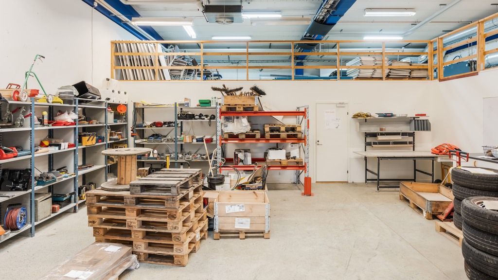 Praktisk lageryta med markport för smidig in- och utlastning. Entresol som ger extra förvaringsmöjligheter och effektivt utnyttjande av takhöjden. Omklädningsrum i direkt anslutning.