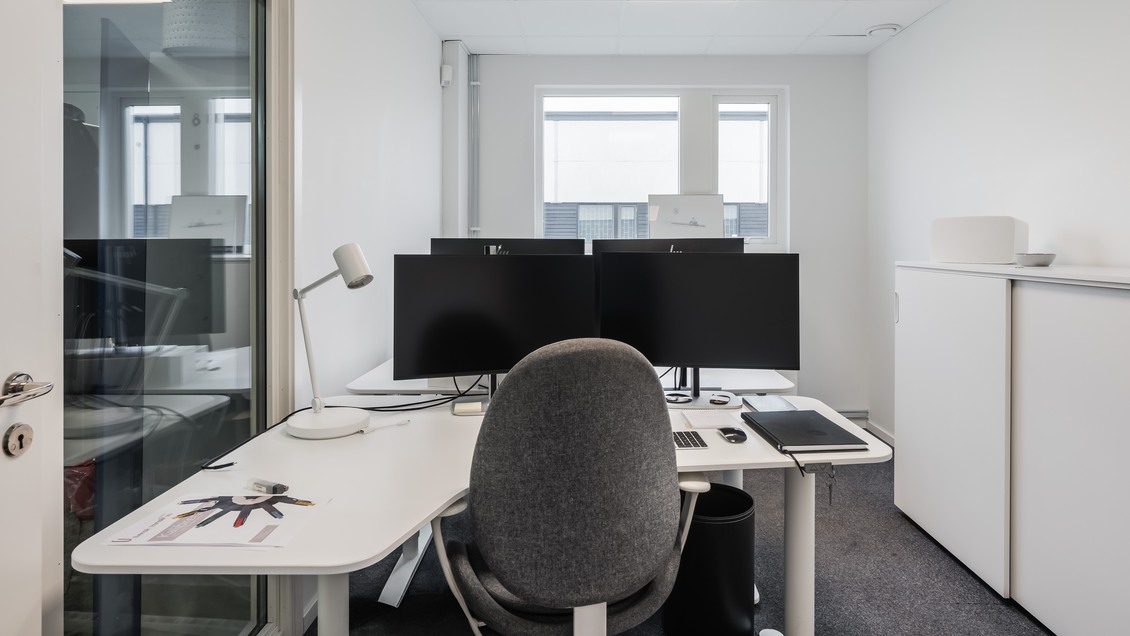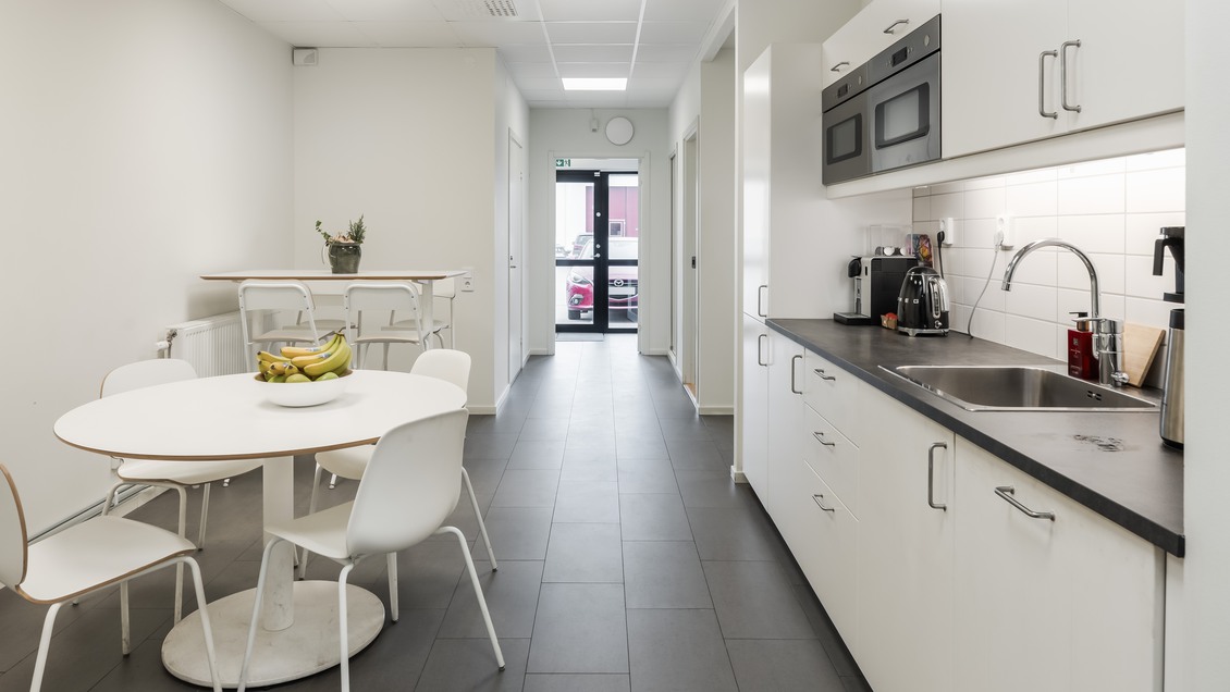 Kontoret erbjuder flera rum i varierande storlek. Här finns även ett fräscht kök med tillhörande matplats - en naturlig samlingspunkt för personalen.