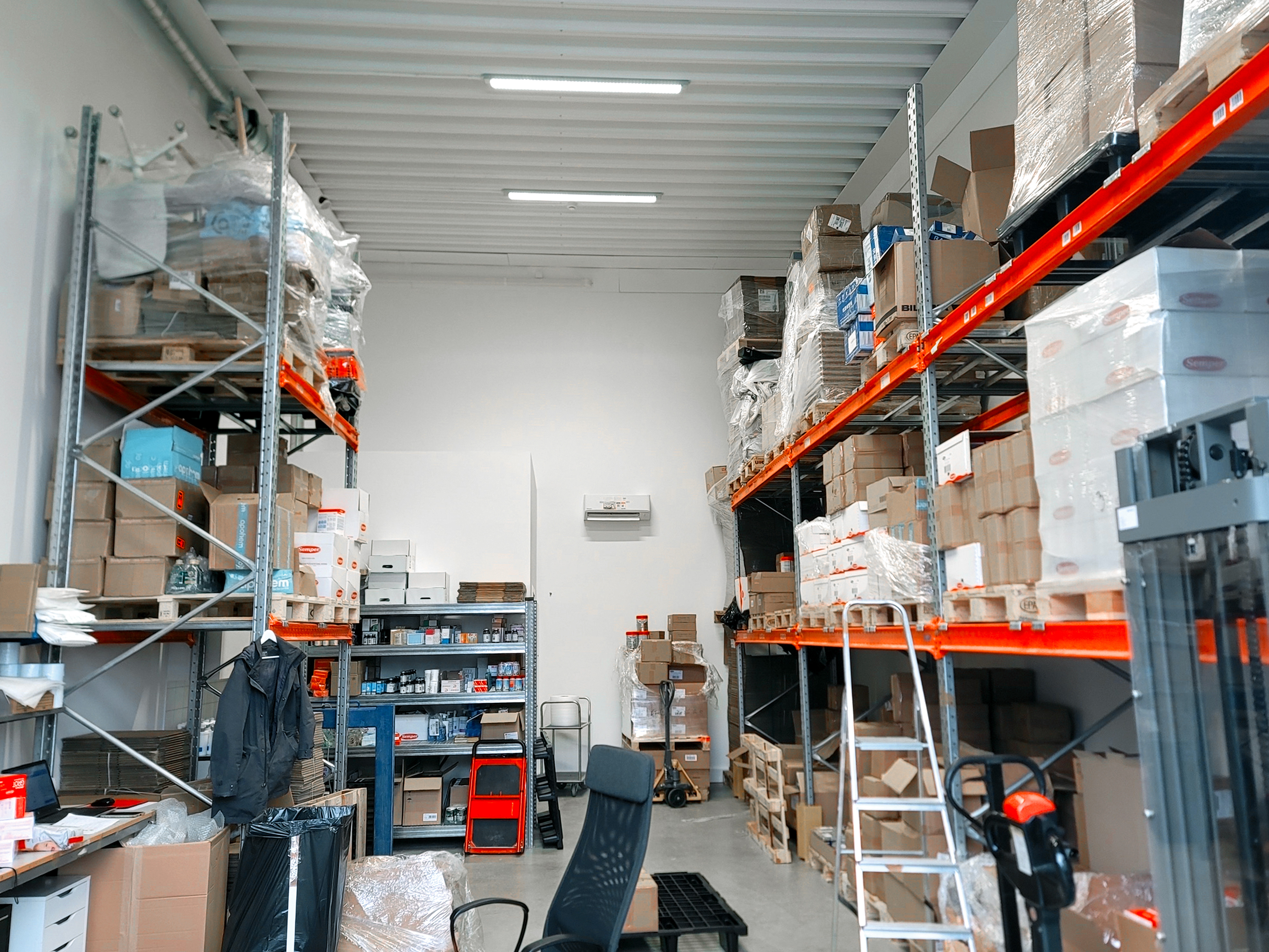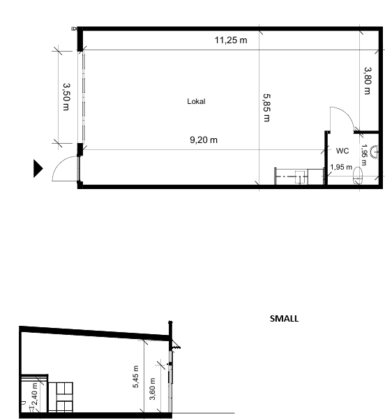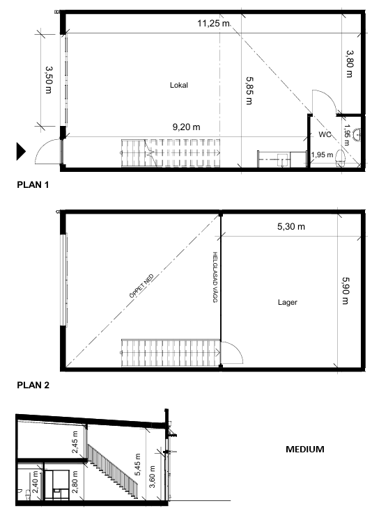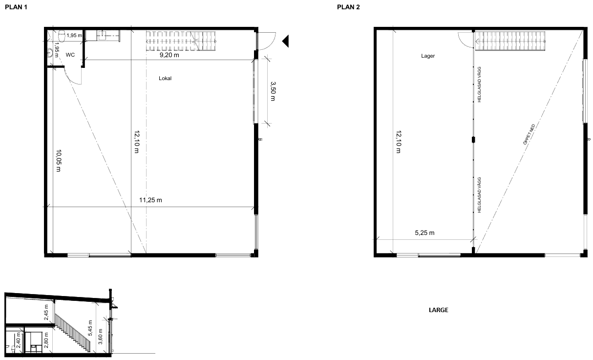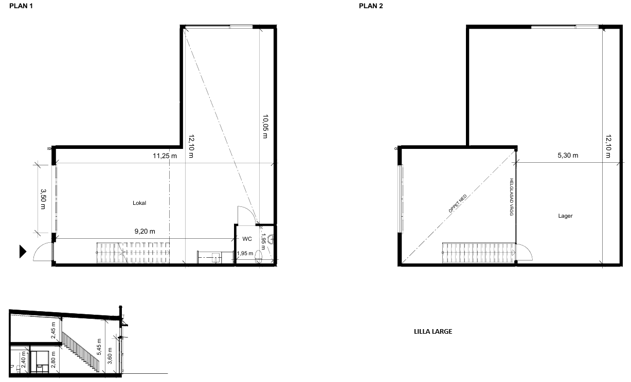 Vår lokal i storlek medium och large fördelas på två plan, varav ett entrésolsplan. Lokalen har vikportar, entrédörr, pentry och WC. Nedervåningen består av en stor yta som kan användas som lager eller lager kombinerat med kontor, medan entrésolsplanet lämpar sig väldigt väl som kontor. Vår lokal i storlek small är likadan som medium men utan entrésolplan. Lokalen är fullt anpassningsbar.