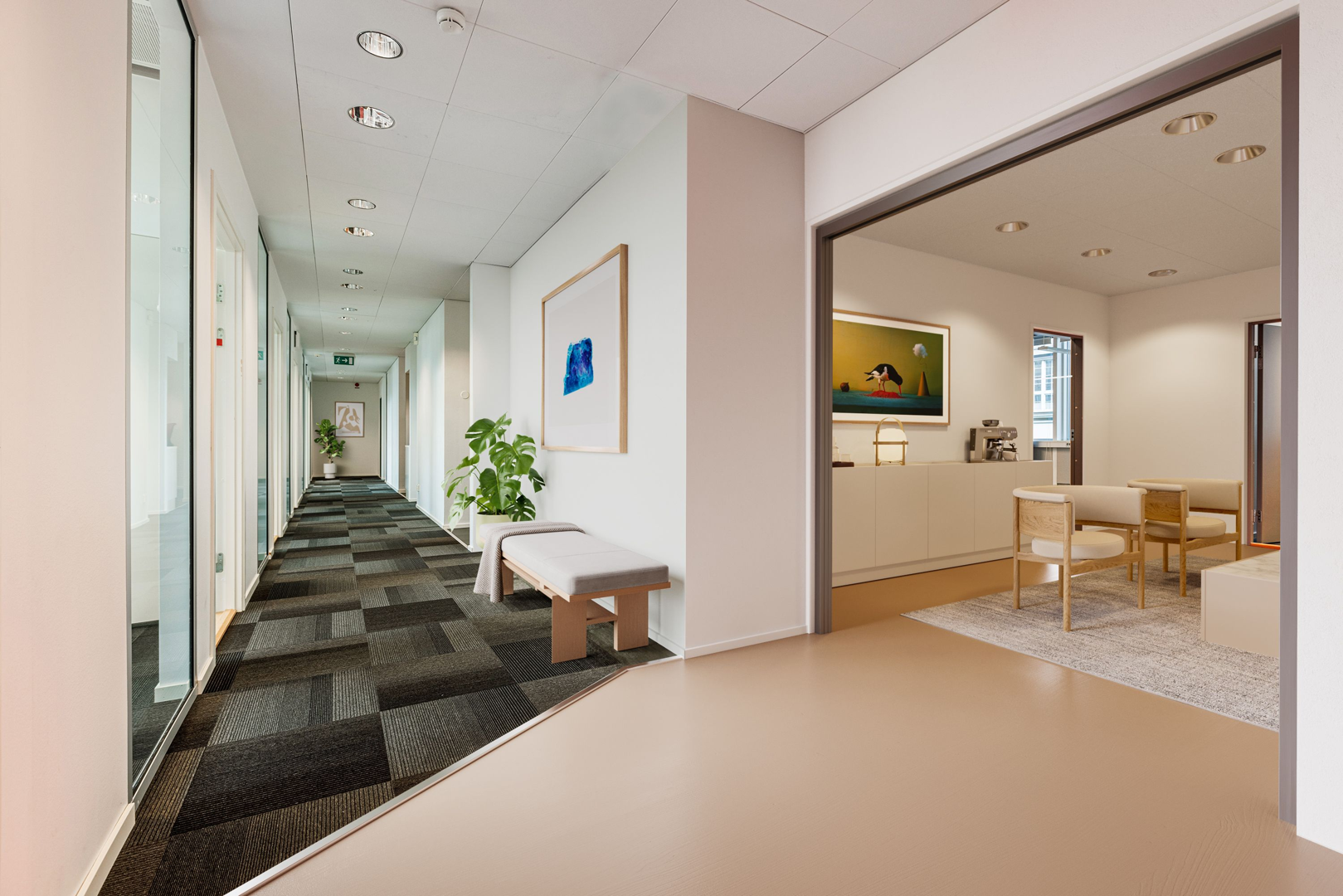 Lokalen har ett härligt dagsljus från två håll och en naturlig samlingspunkt i köket som ligger centralt placerat i mitten av kontoret. Planlösningen gör det dessutom enkelt att dela upp ytan mellan extern och intern del, vilket ger en flexibel och funktionell arbetsmiljö.
