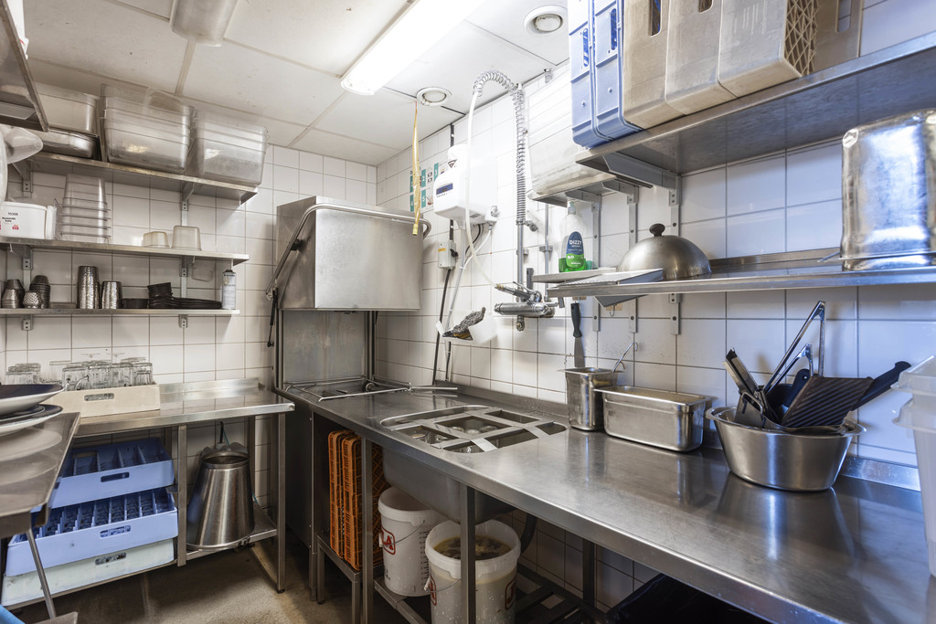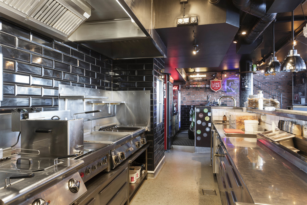 Fullt utrustat kök med öppet koncept. Svartplåts kanal och fettavsklijare på plats.