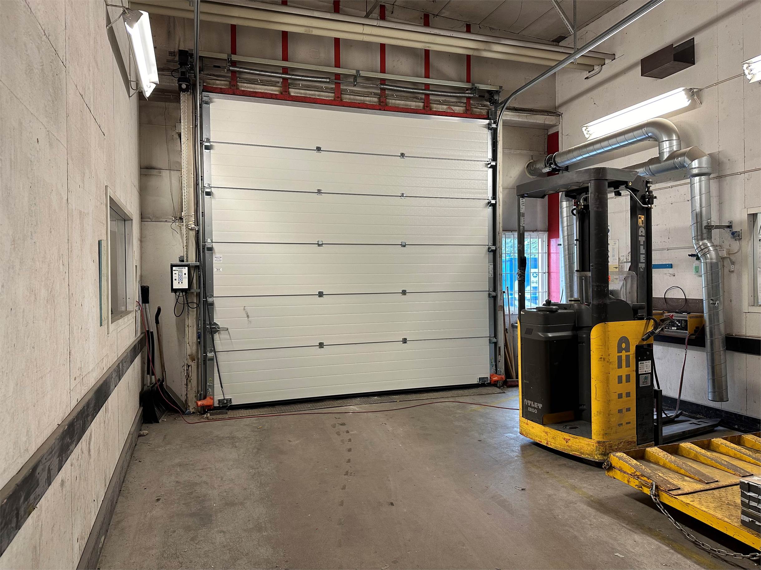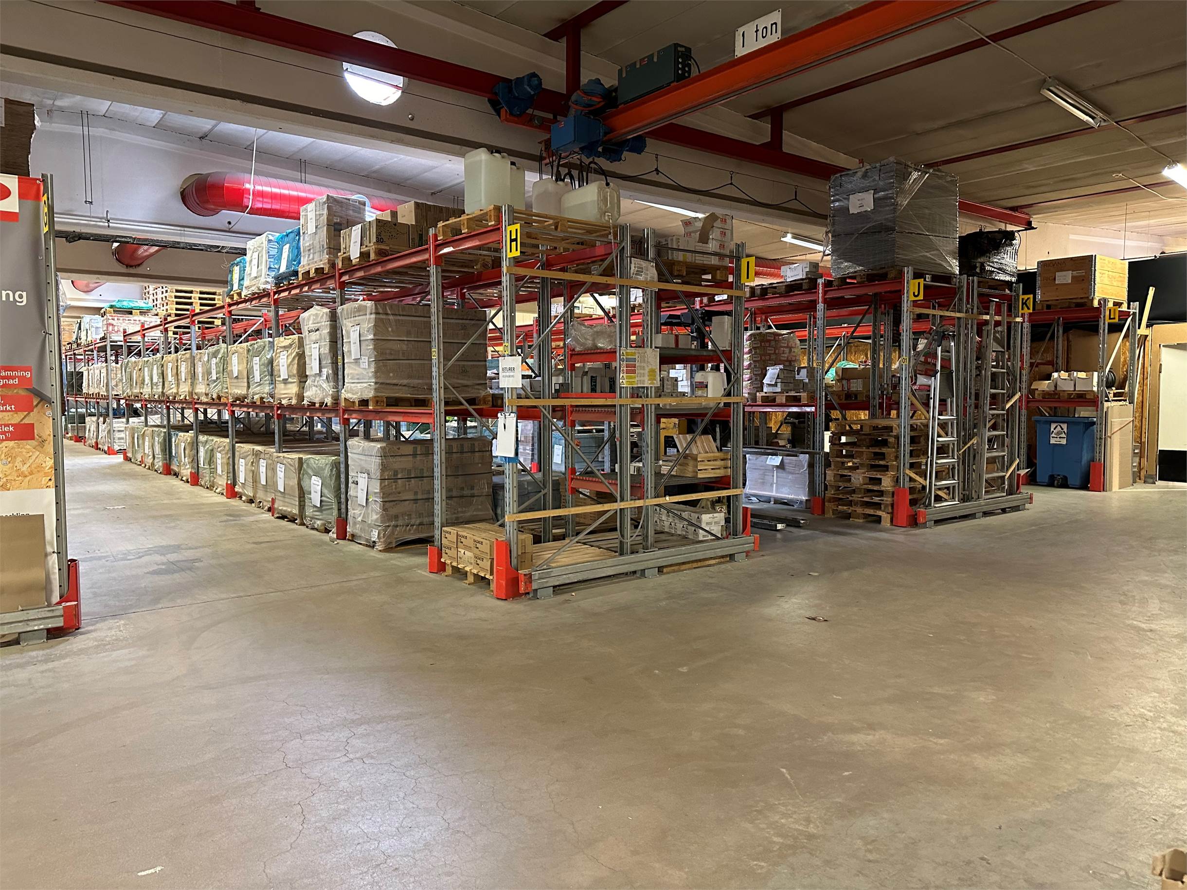 Stor lager eller industrihall med separat kök/pentry och wc i den bakre ytan.