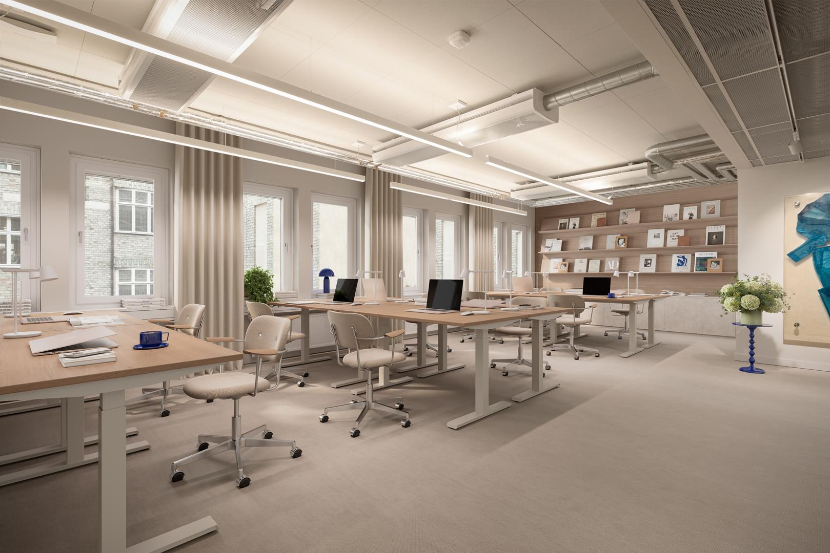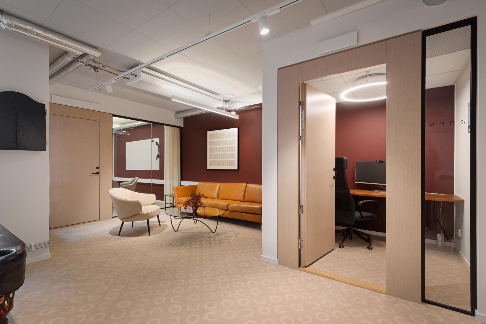 Trevlig lokal med en blandning av öppet landskap, kontorsrum och platser för mindre möten och telefonsamtal. Här finns också ett pentry för lunch och gemenskap.