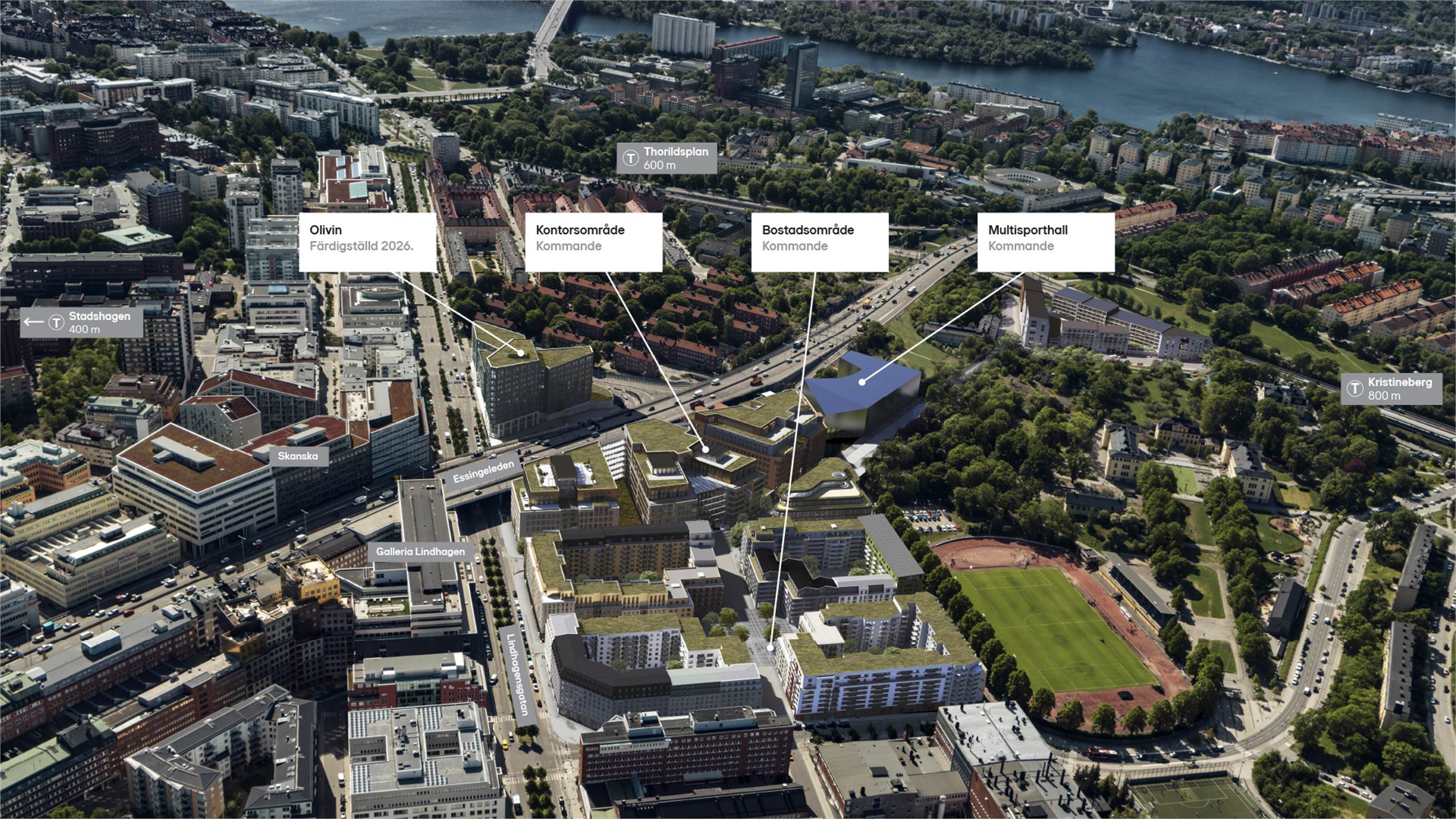 Hornsberg är en plats full av liv och rörelse som passar den aktiva medarbetaren. Närheten till vattnet och sportfaciliteter gör det smidigt att paddla, löpa eller träna i samband med arbetet. Caféer, restauranger och barer ger platsen en vibrerande atmosfär för boende och arbetande i området. Det stora utbudet av service- och träningsmöjligheter bidrar också till platsens puls. Olivin blir en signaturbyggnad för Lindhagensgatan och ger stadsstrukturen en komplett känsla.