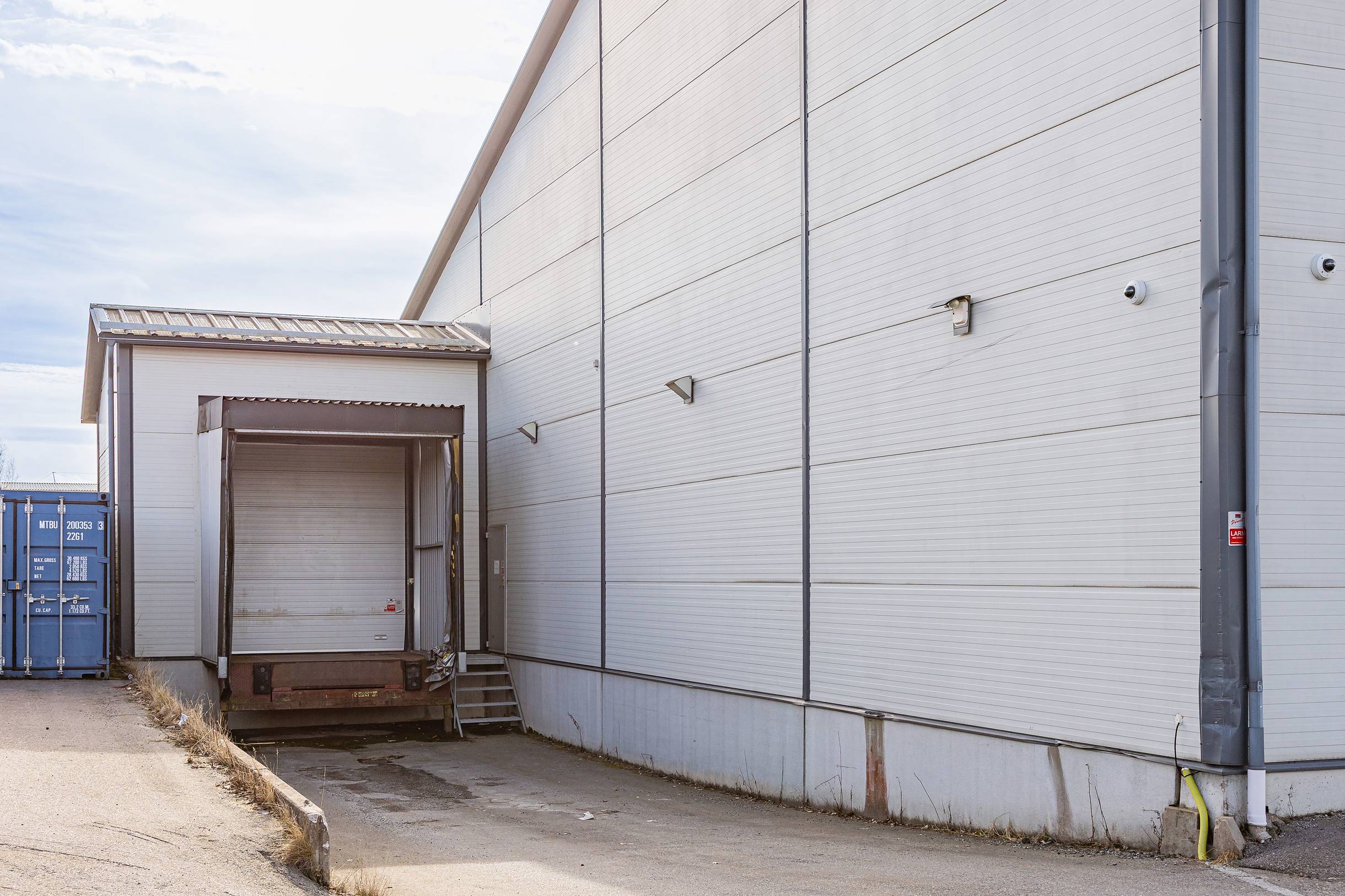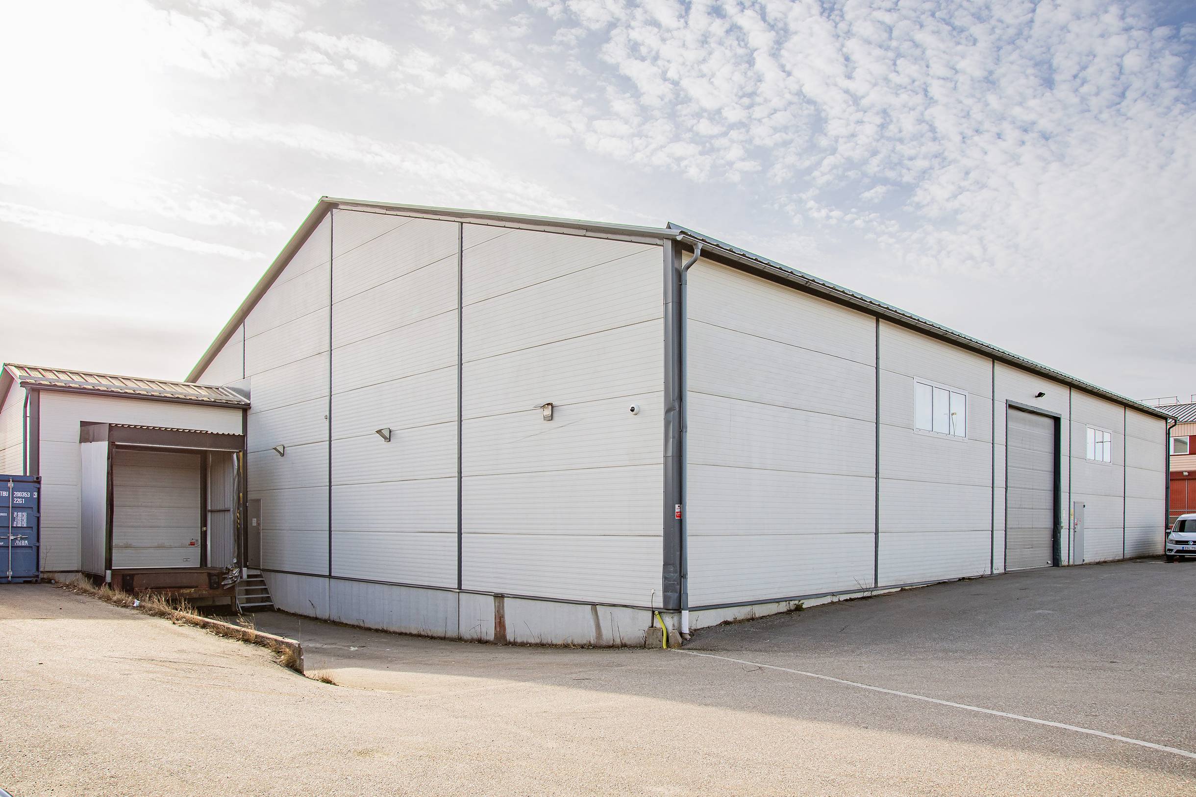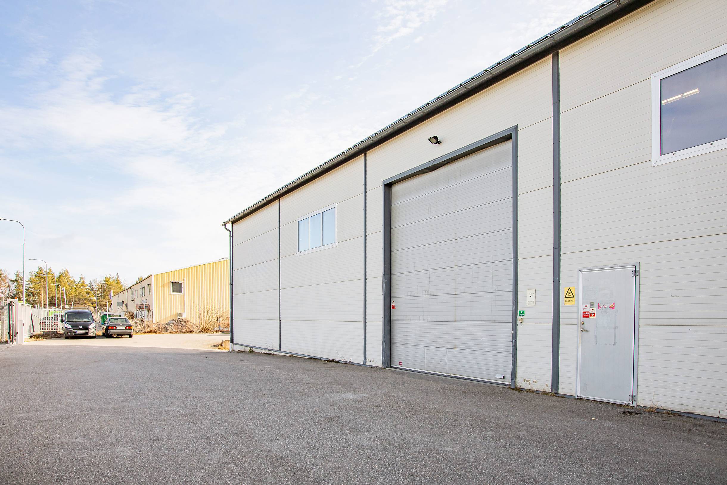 Modern lagerbyggnad med markport och lastkaj – Jordbro industriområde