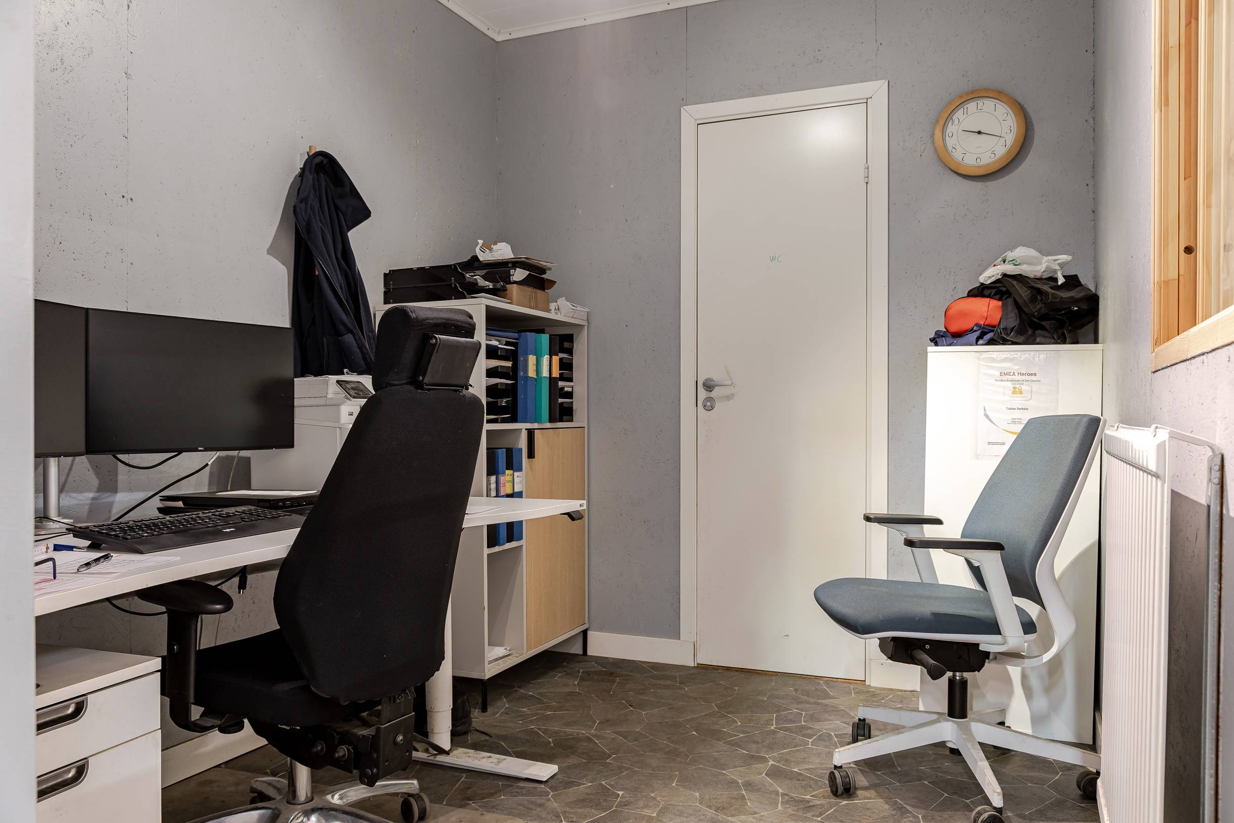 I nuvarande utförande finns ett kontorsrum samt en WC, vilket ger grundläggande personalutrymmen.