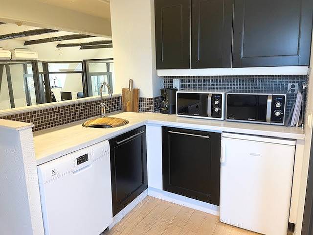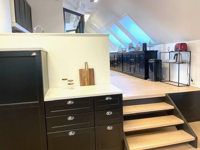 Öppet kök i korridoren för spontana möten vid kaffemaskinen