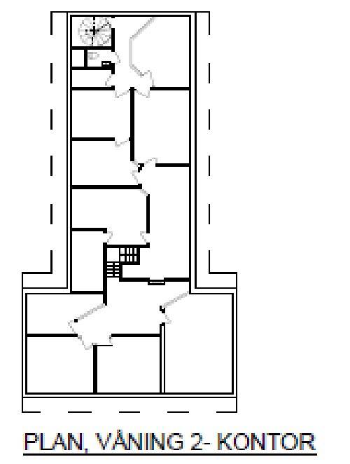 9 kontorsrum, ett konferensrum, kök i korridor och toalett på andra våningen. Ca 350 kvm lager i bottenplan.