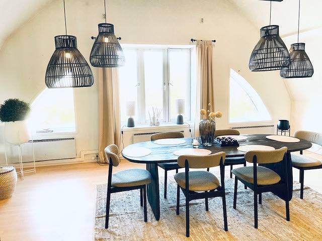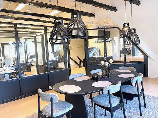 Stora glaspartier, öppet tak och synliga takbjälkar som ger en unik känsla av rymd och ljus
