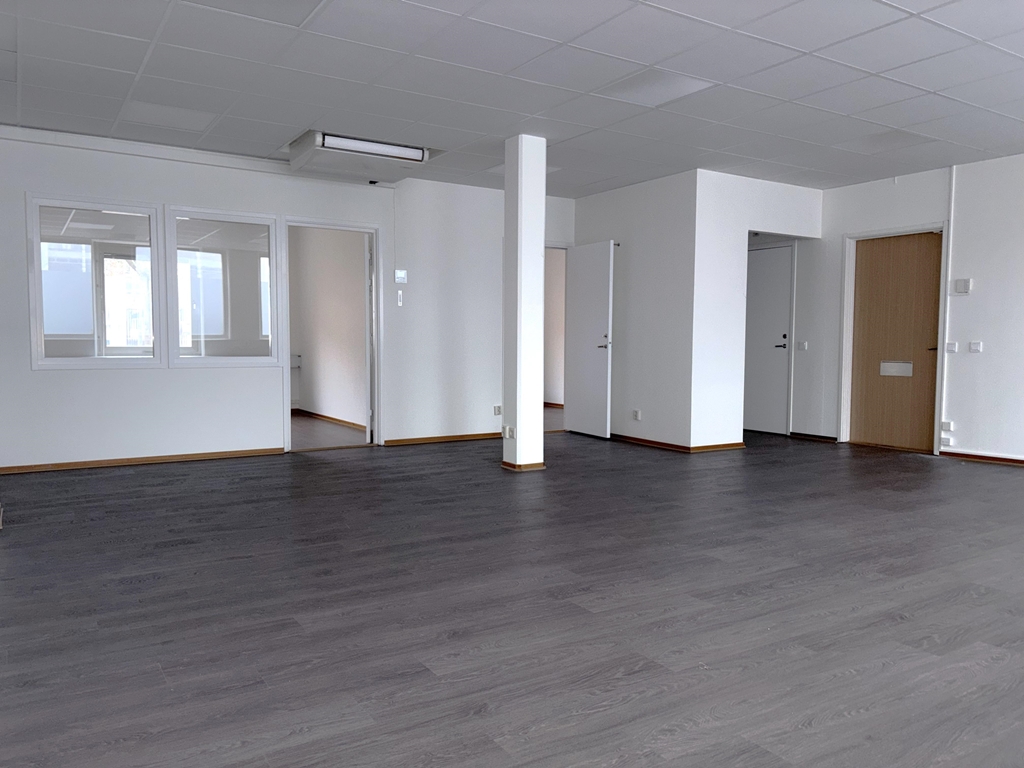 Här finns tre kontorsrum, en större öppen yta och ett kök/konferensrum med pentry. WC finns i anslutning till entrén.