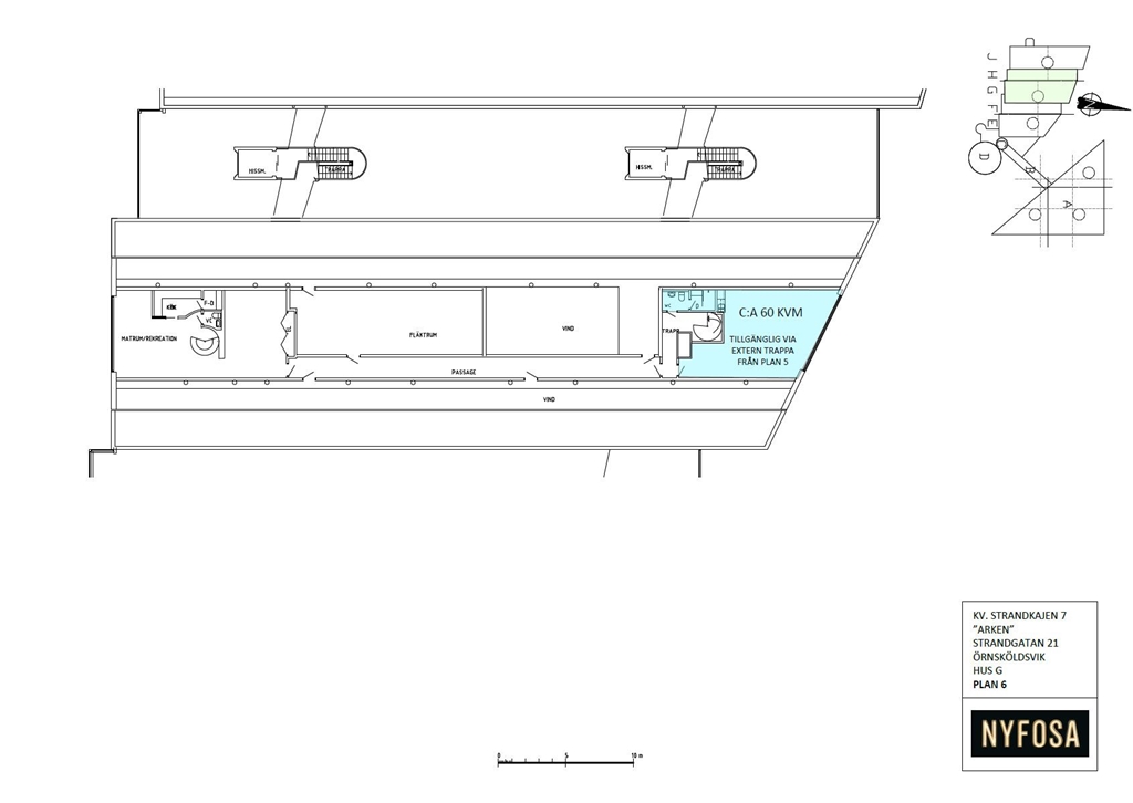 På det tre nedre våningarna, plan 3-5, så finns det på varje våning två ytor om ca 175 kvm respektive 405 kvm vardera. Och på plan 6 finns ytterligare en lokal om ca 60 kvm, vilken nås via en spiraltrappa från plan 5.