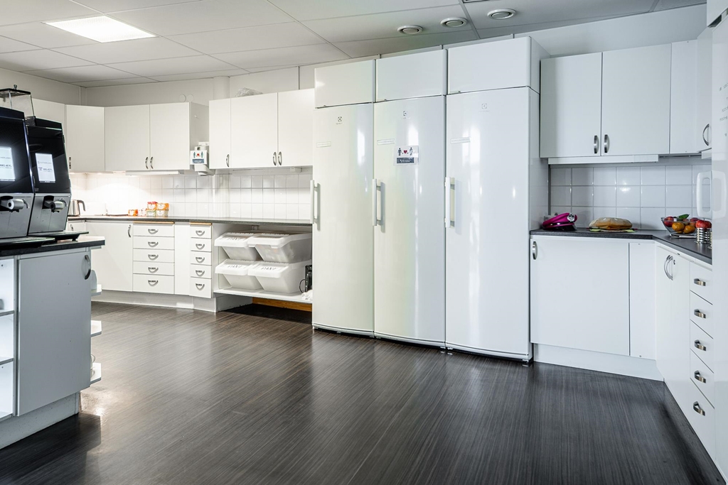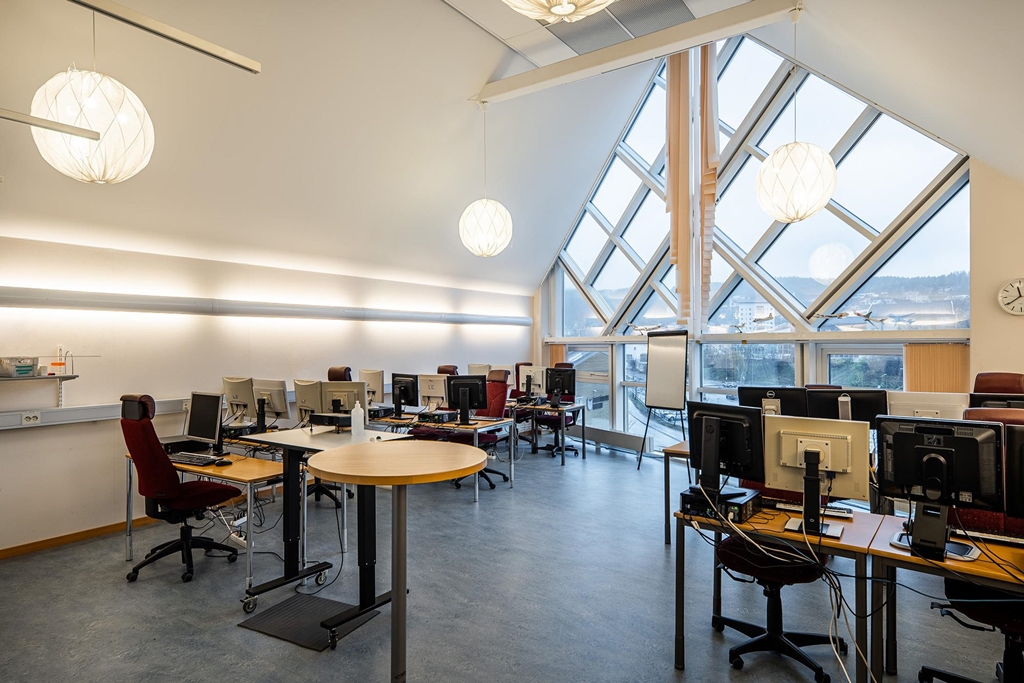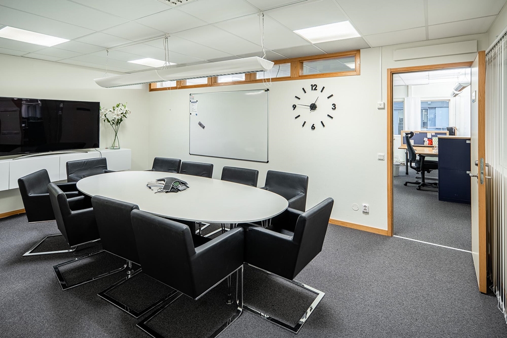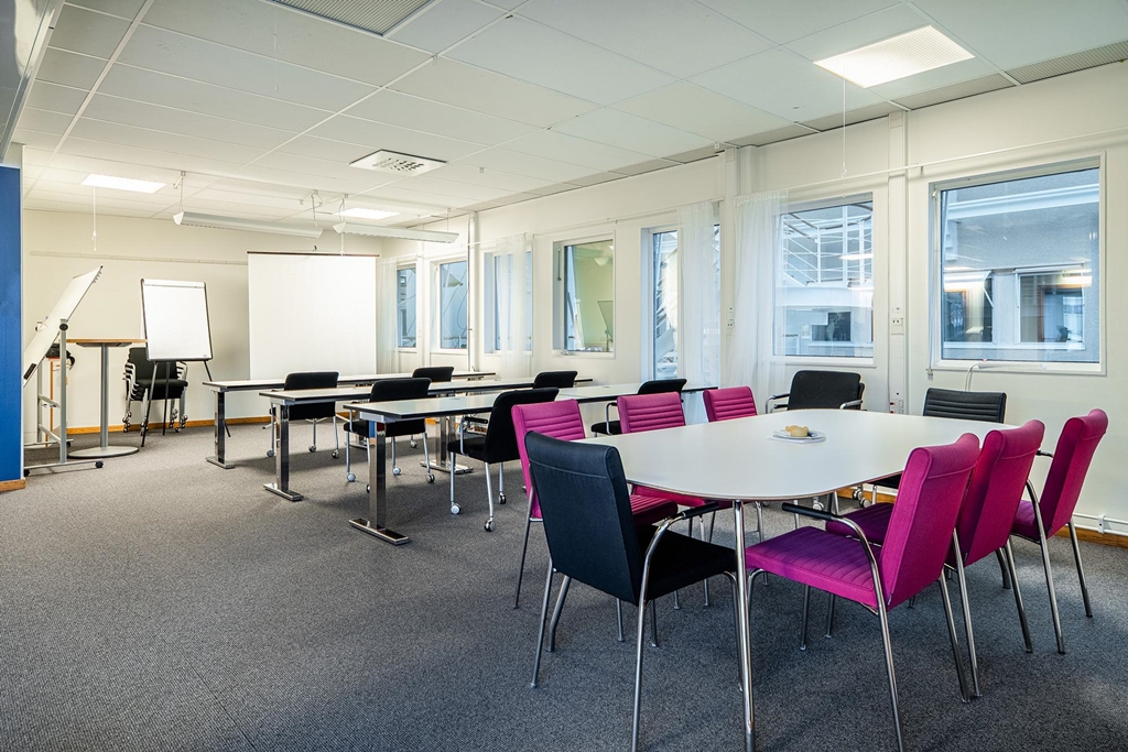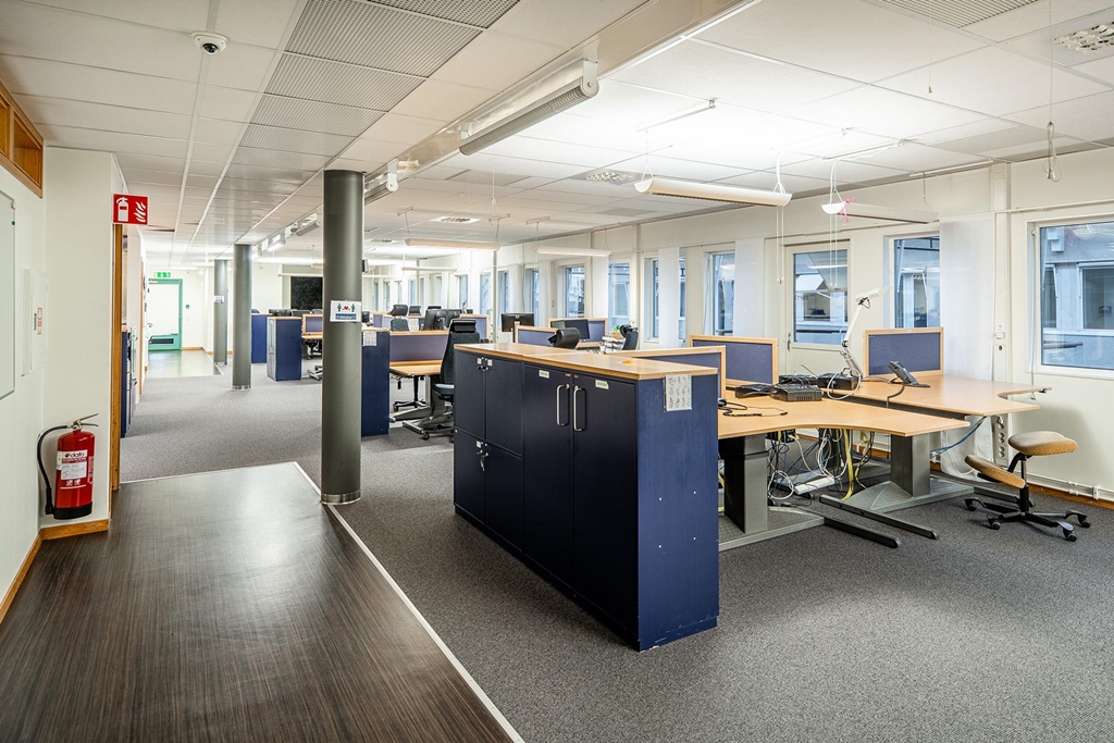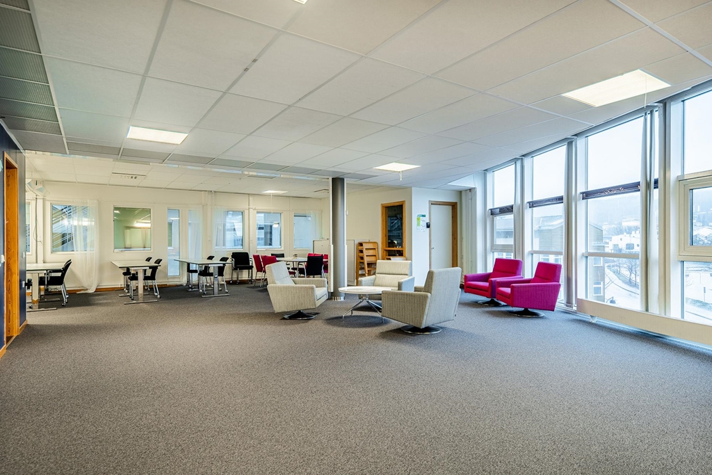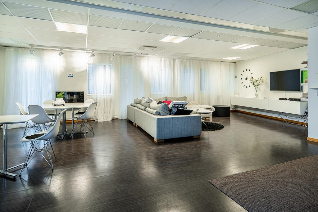 Lokalerna har fräscha ytskikt med vitmålade väggar, ljudabsorberande undertak, och en smakfull kombination av textilmattor, parkettgolv och linoleummattor.