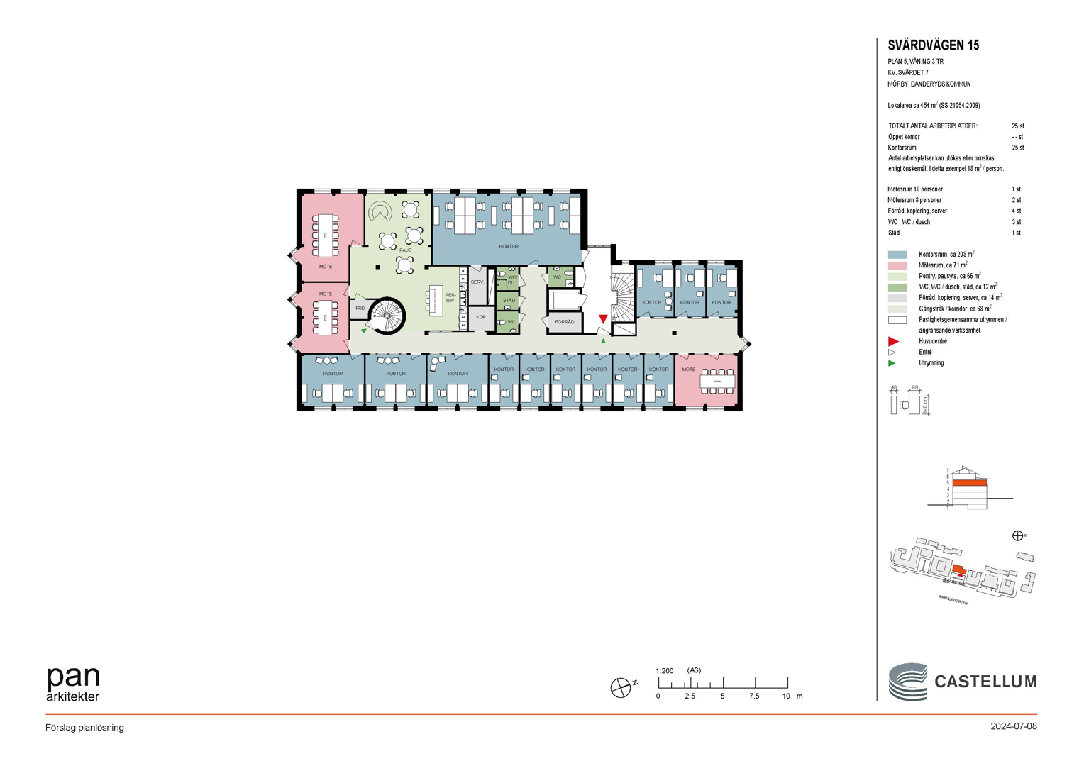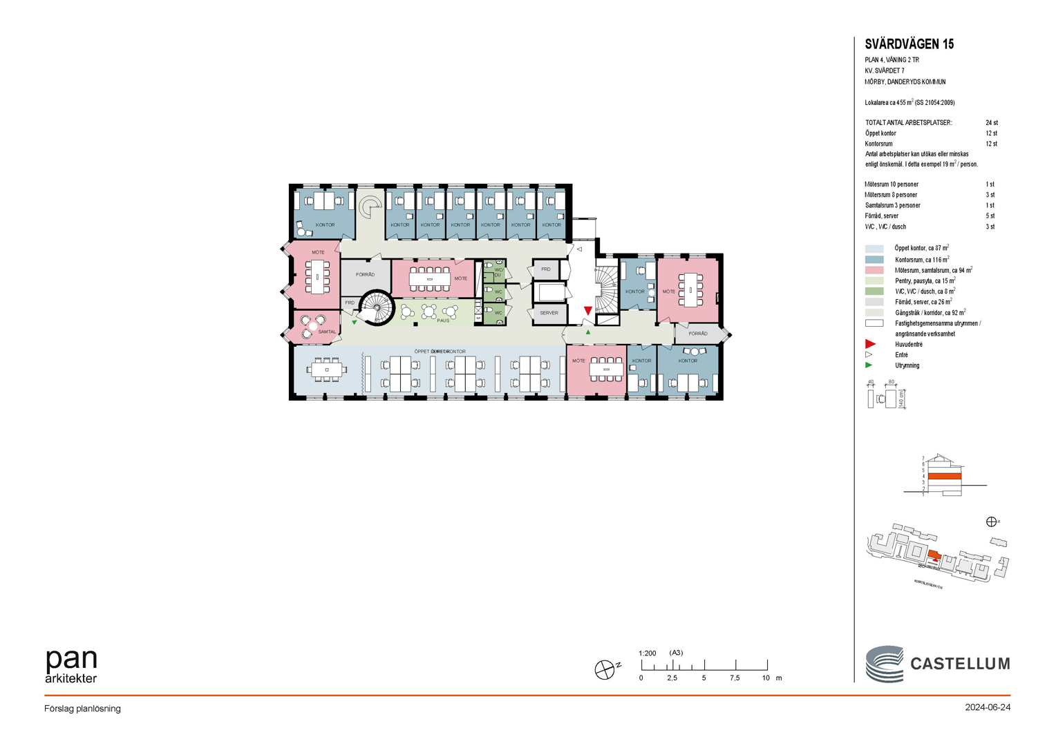 På första planet (plan 3) finner du en yta om 455 kvm, utrustad med en välkomnande reception och lounge, fyra öppna arbetsplatser, 14 kontorsrum och två mötesrum.