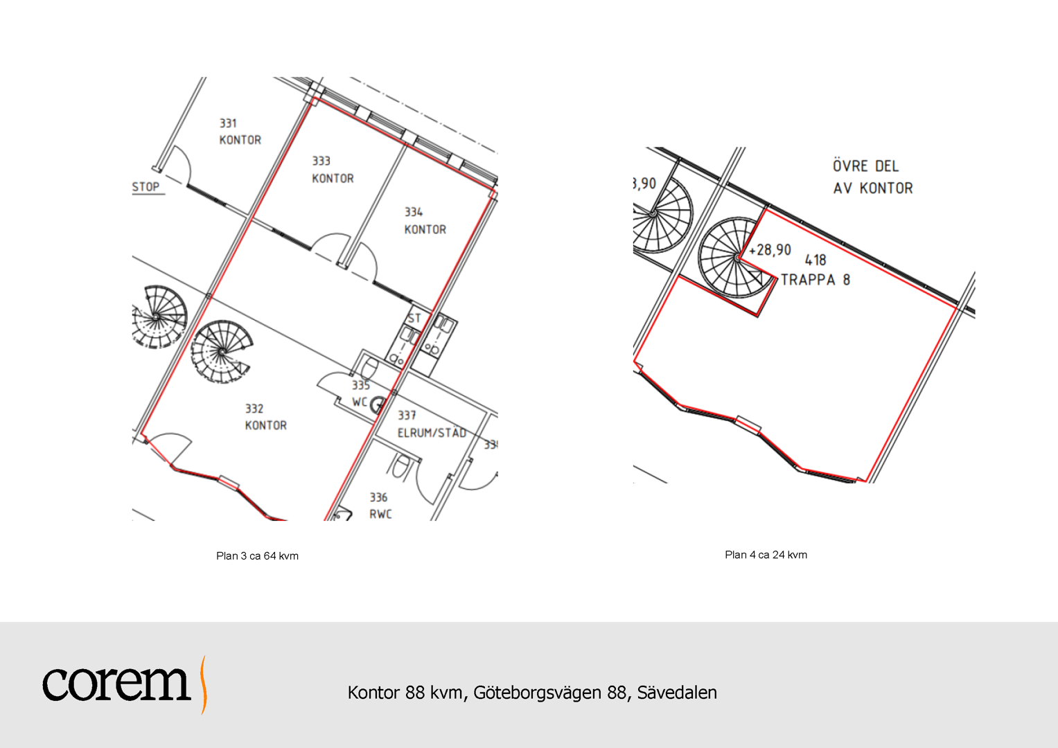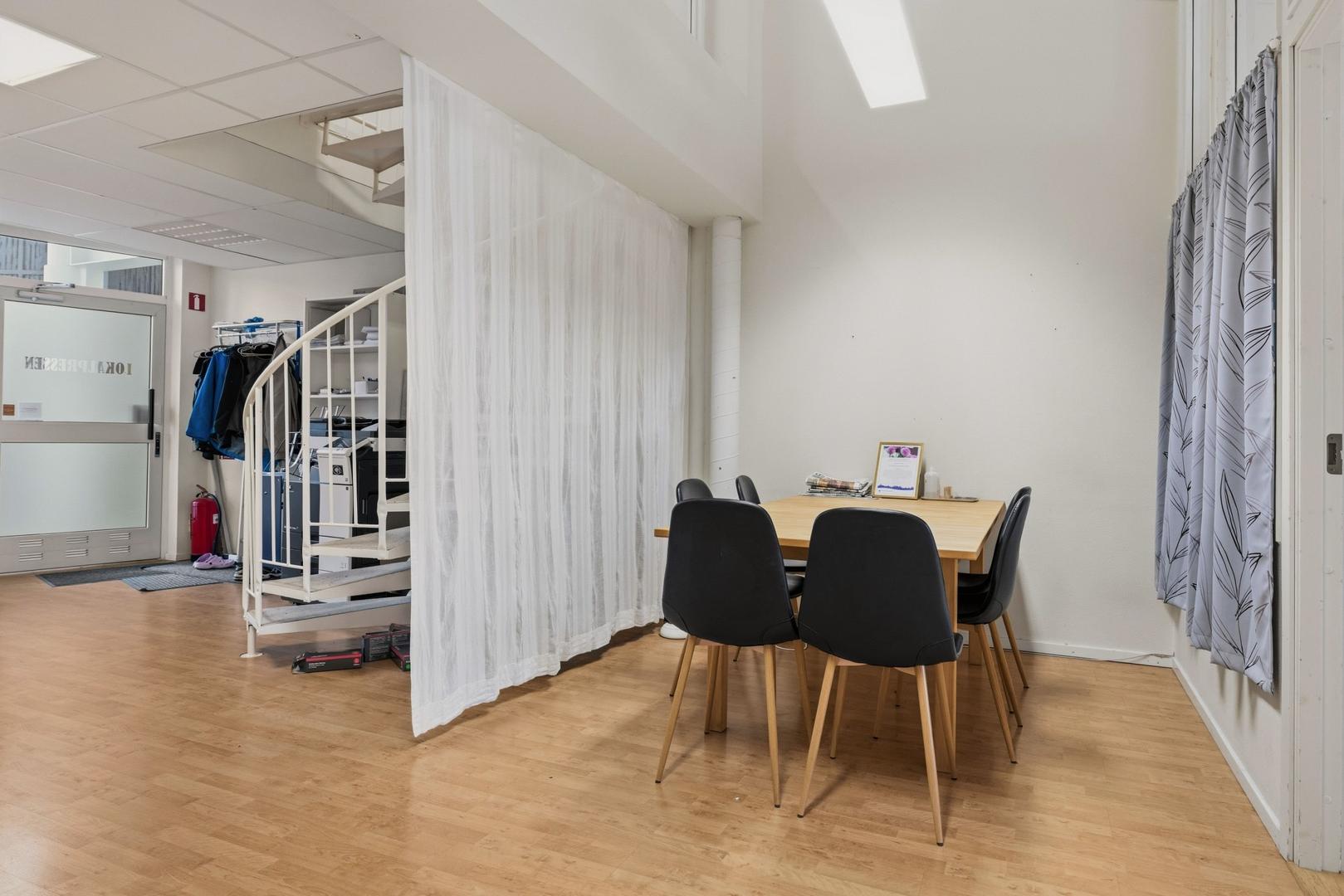 På entréplan möts du av en välkomnande yta med pentry och plats för fika. Här finns också två kontorsrum, som lämpar sig för både fokuserat arbete i enskildhet och kreativa möten tillsammans. Övre plan nås via en spiraltrappa och ger extra flexibilitet i planlösningen. Denna del av lokalen går nämligen att forma utifrån din verksamhets behov. Den lämpar sig till exempel för ytterligare arbetsplatser, förvaring eller projektbaserad verksamhet.