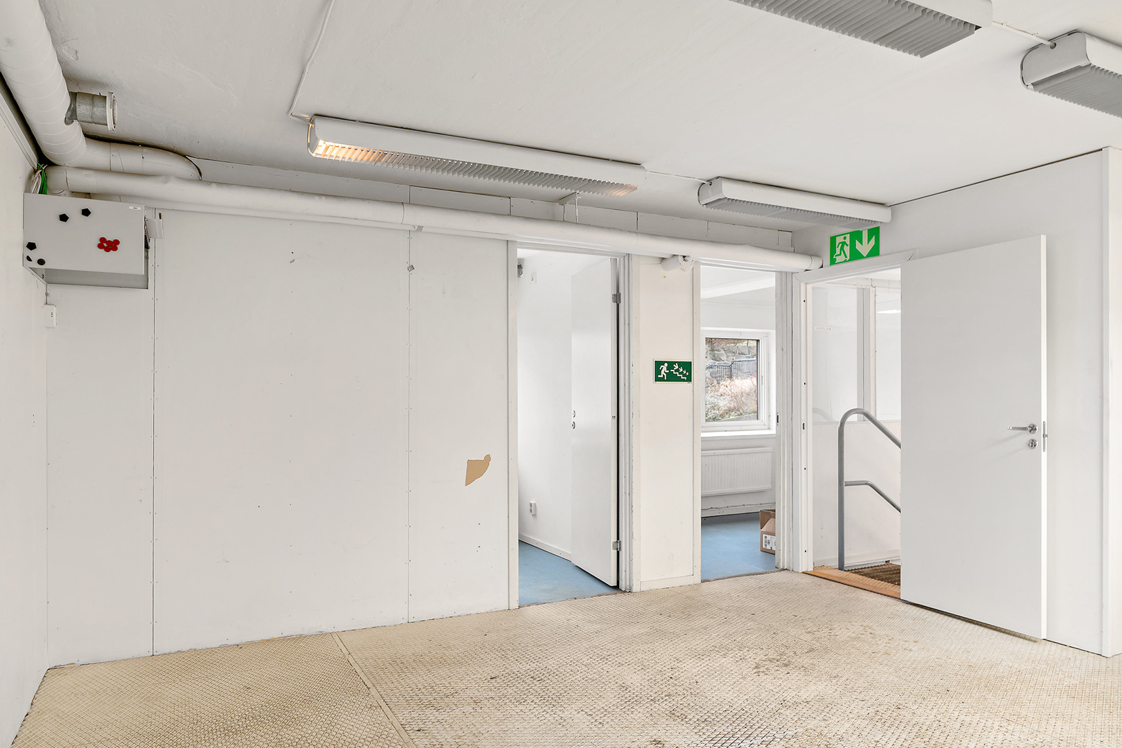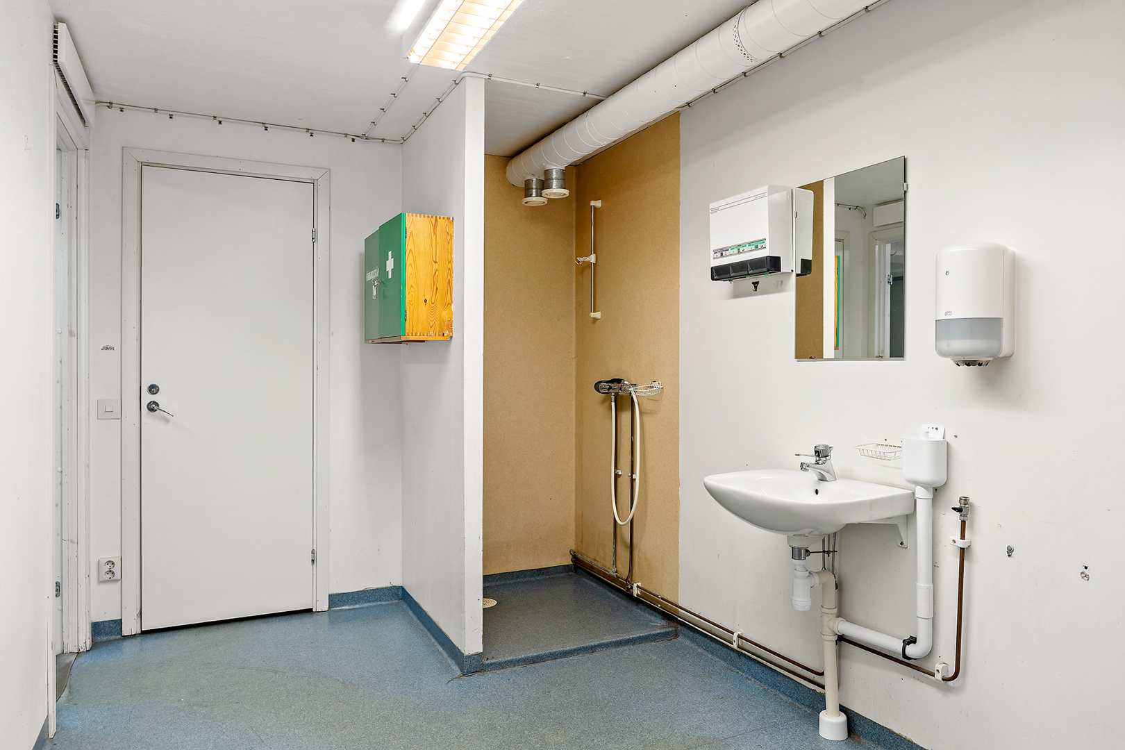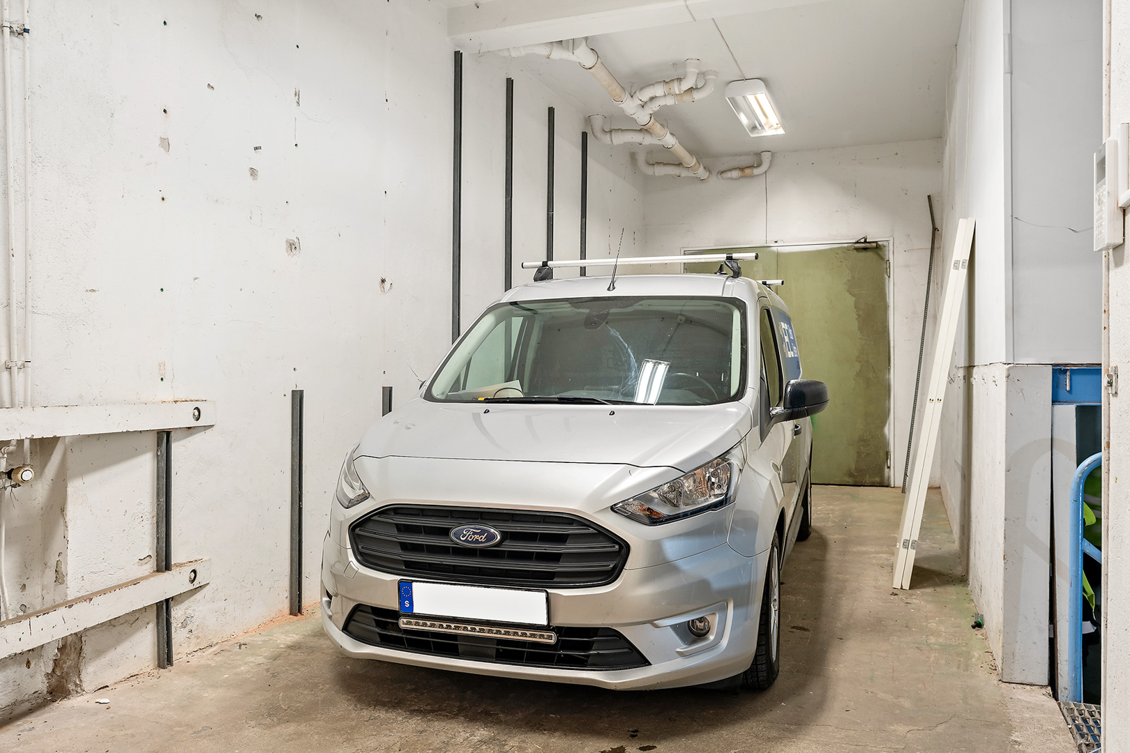 Det finns plats för uppställning av två bilar samt en lagerdel. En praktisk förrådsyta i källaren och ljust kontorsutrymme för administrativt arbete en trappa upp. Pausrum samt wc och dusch är också beläget en trapp upp.