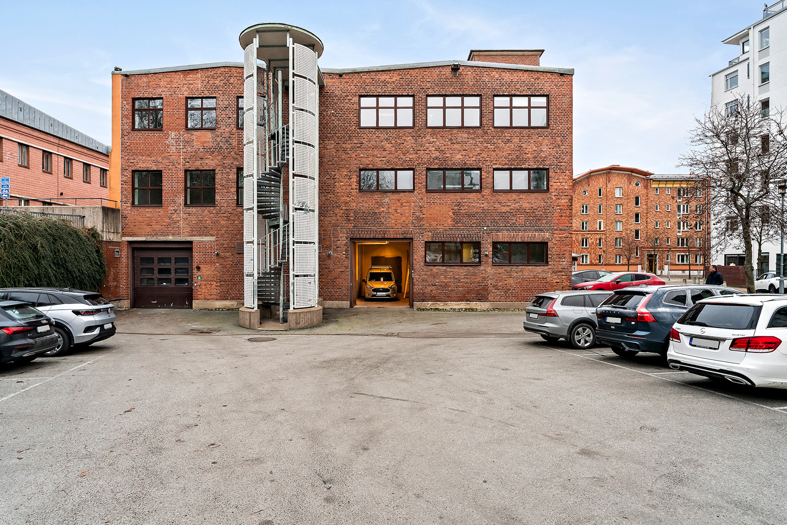 Lager med port i markplan samt kontorsutrymme och personalyta en trappa upp.