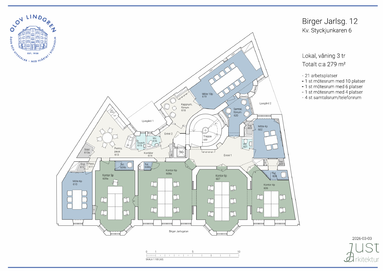 Exklusiv kontorslokal med rum i fil ut mot Birger Jarlsgatan. Välbevarad stuckatur, paneler och takmålningar i representativ miljö. På Birger Jarlsgatan 12 erbjuds en kontorslokal på våningsplan 3 med bästa läge i CBD för verksamheter som vill sitta rätt och ta emot kunder i en representativ miljö. Lokalen är i klassisk våningsstil med välbevarade originaldetaljer som stuckaturer, paneler och takmålningar. Rum i fil ut mot Birger Jarlsgatan skapar en tydlig struktur med naturlig separation mellan mötesrum, arbetsrum och social yta. De stora rummen och den generösa takhöjden ger volym och lugn, vilket är en fördel både för arbetsmiljö och för kundmöten. Här får ni en lokal som fungerar som ett verktyg i affären, med tydlig identitet och hög standard i uttrycket. Total yta; 279 kvm. Planlösning med flera rymliga rum mot gatan. Möjlighet till mötesrum och arbetsrum med bra flöden. Ekonomi Hyresnivå lämnas efter dialog. Tillträde enligt överenskommelse. Planritning och övriga handlingar finns bifogade. Tekniska specifikationer lämnas vid förfrågan.