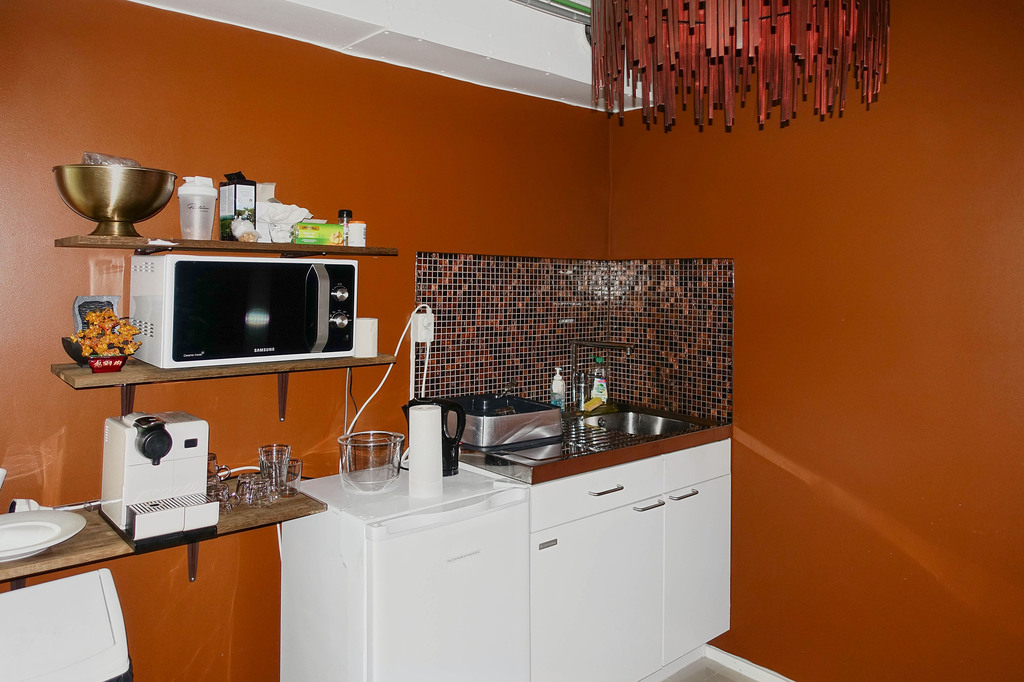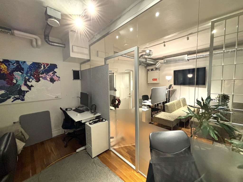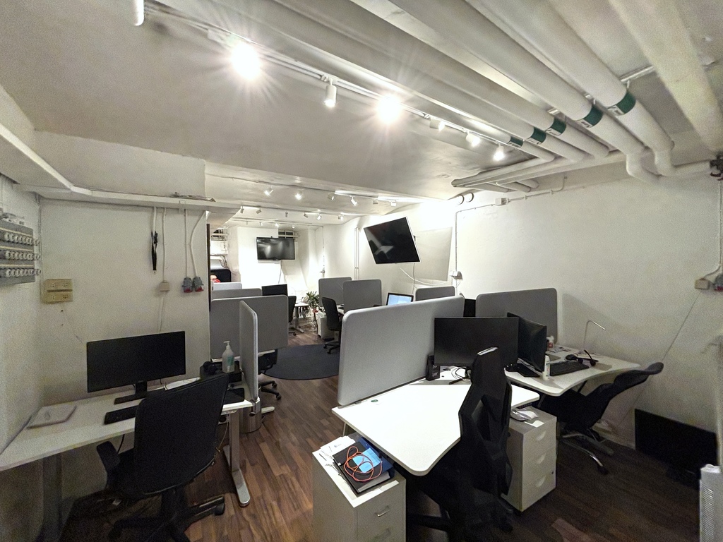 Vid ingången finns ett kontorsrum samt plats för en lounge. Innanför ligger ett större kontorsrum som även fungerar som konferensrum. Lokalen har ytterligare ett kontorsrum, pentry och förråd.
