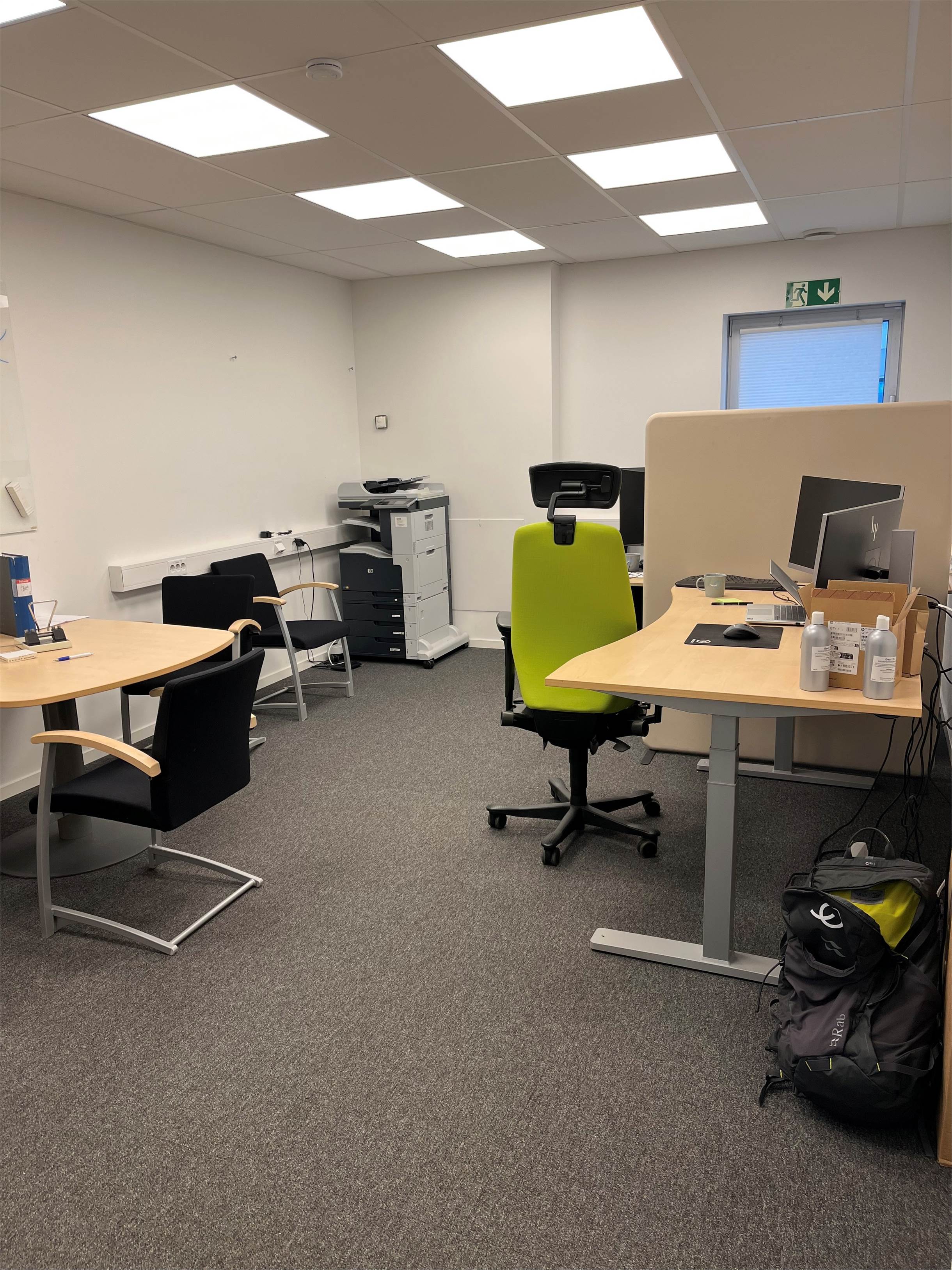 Öppen planlösning med ett extra förråds rum samt kontor med pentry.