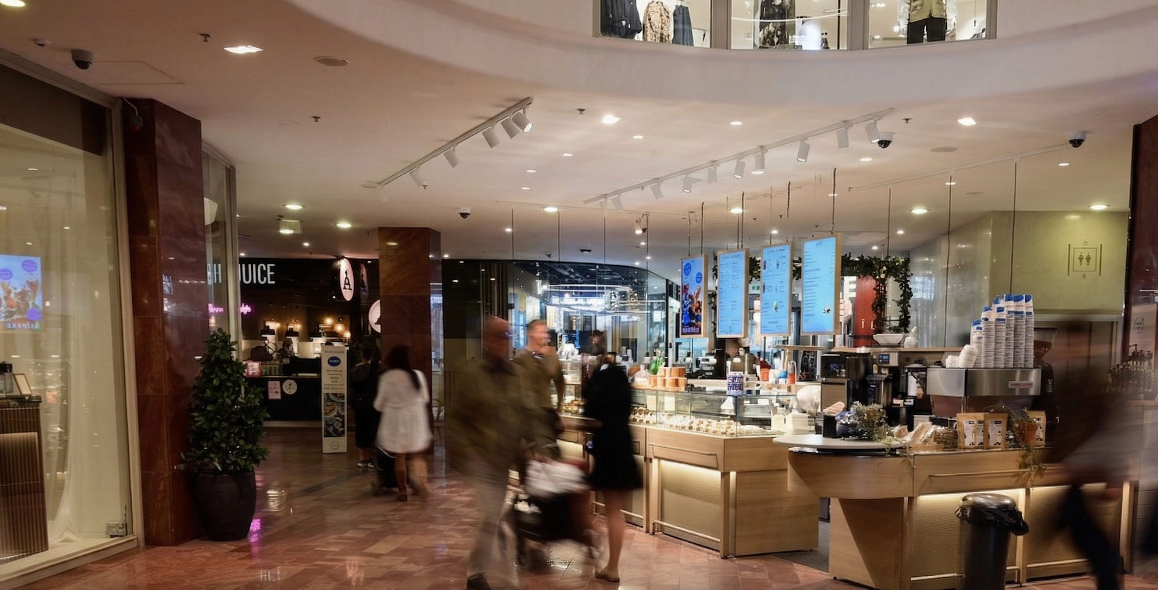 På entréplanet möts du av välkända varumärken, såsom Krons, Volt & John Henric samt Apotek och flera olika lunchalternativ.