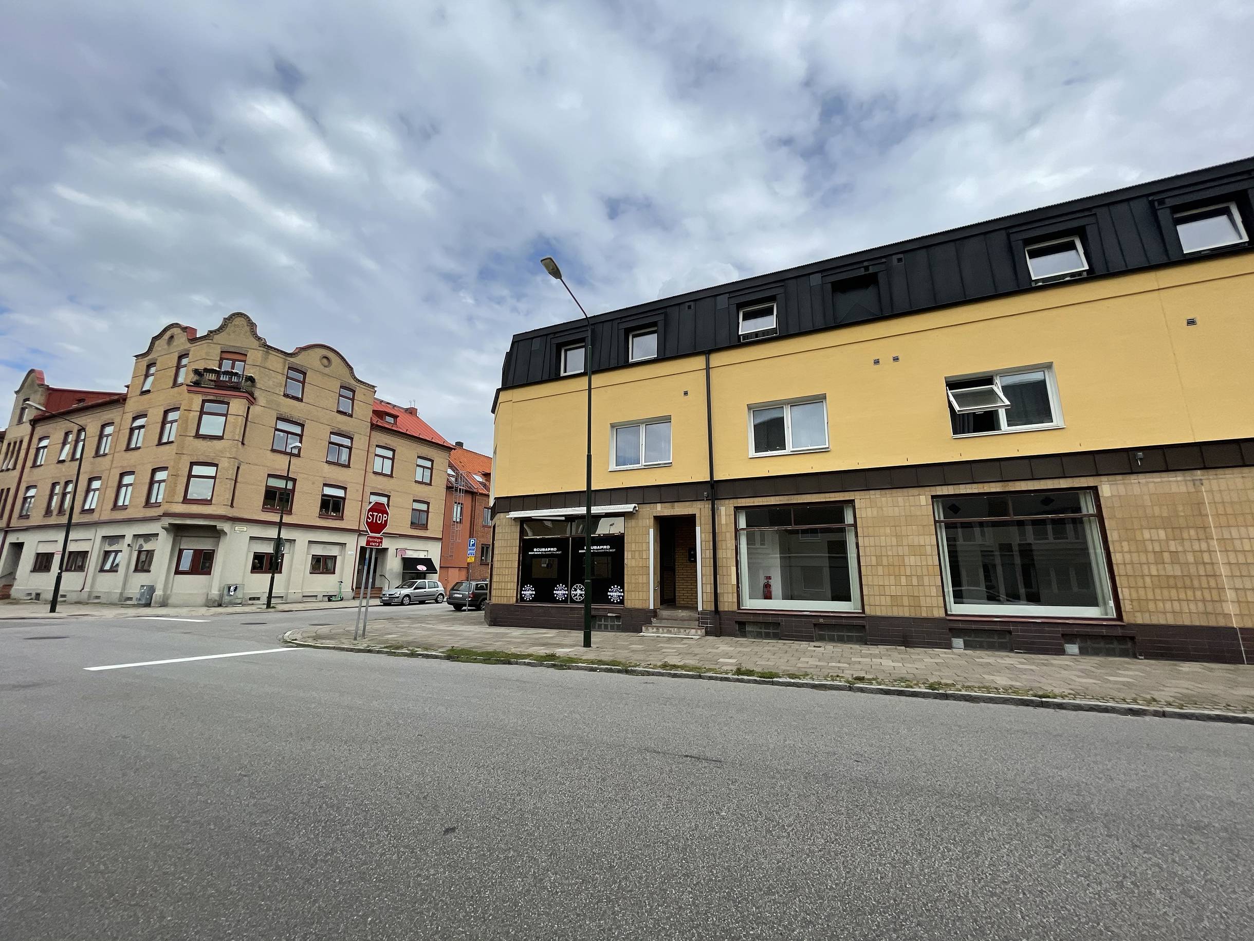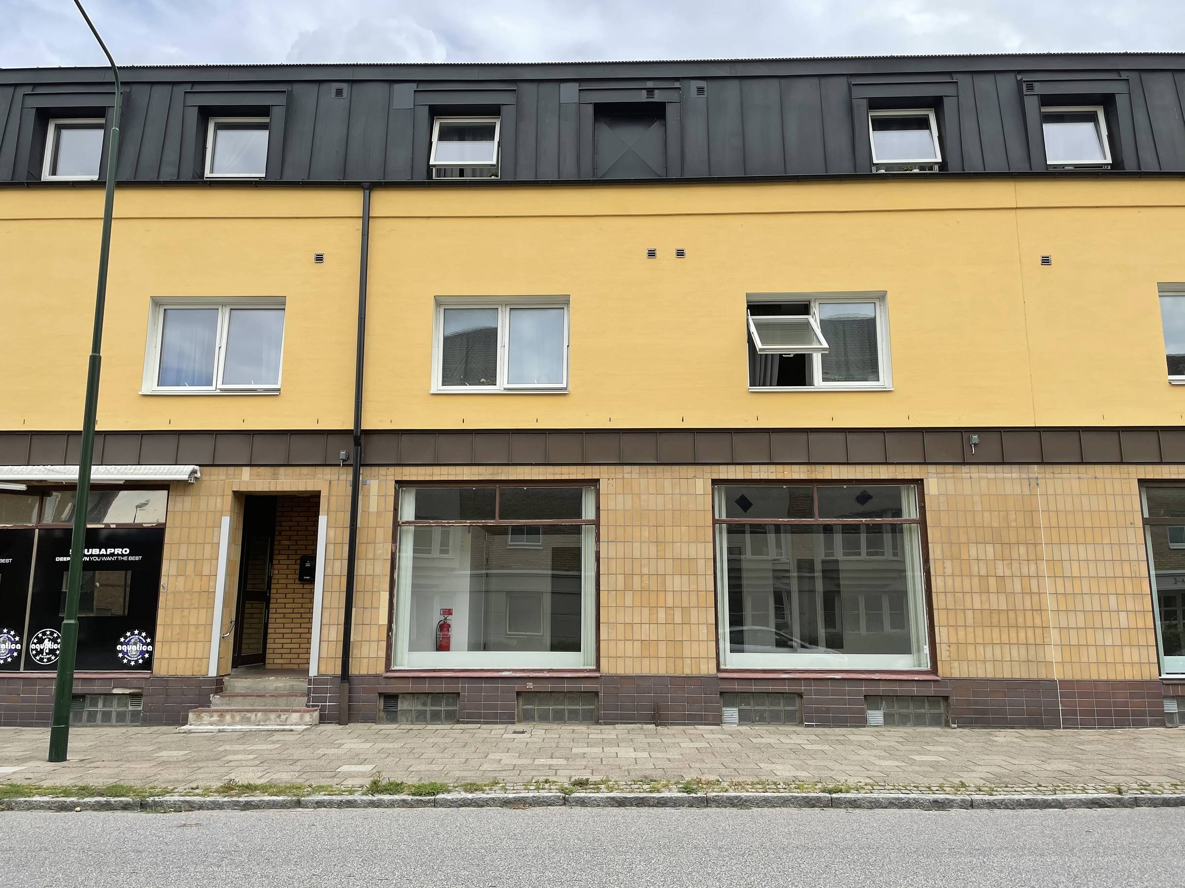 Stora skyltfönster ut mot Idrottsgatan som dagligen passeras av fotgängare, bilister och cyklister.