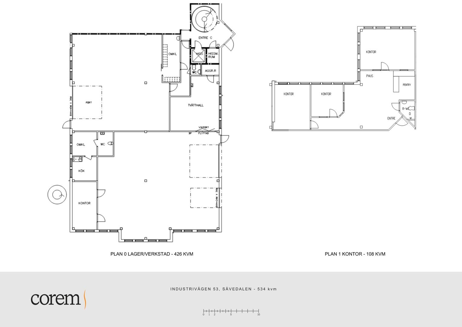 Lagret om 426 kvm är generöst tilltaget med bra takhöjd som möjliggör effektiv förvaring. Lokalen har tre portar, två placerade på ena långsidan och en på motsatt sida, vilket underlättar både in- och utlastning. Här finns även god yta för hyllsystem, maskiner och intern arbetsyta. Tillsammans skapar lagret och kontoret en komplett lösning som passar företag inom handel, distribution, entreprenad eller service.