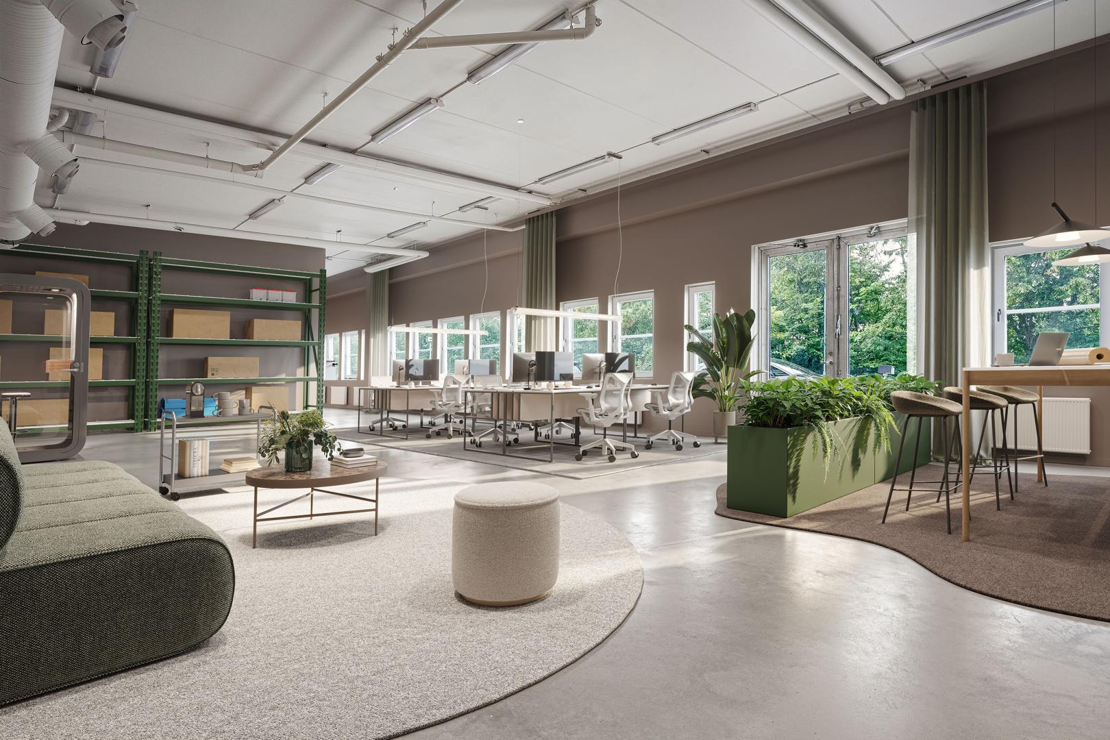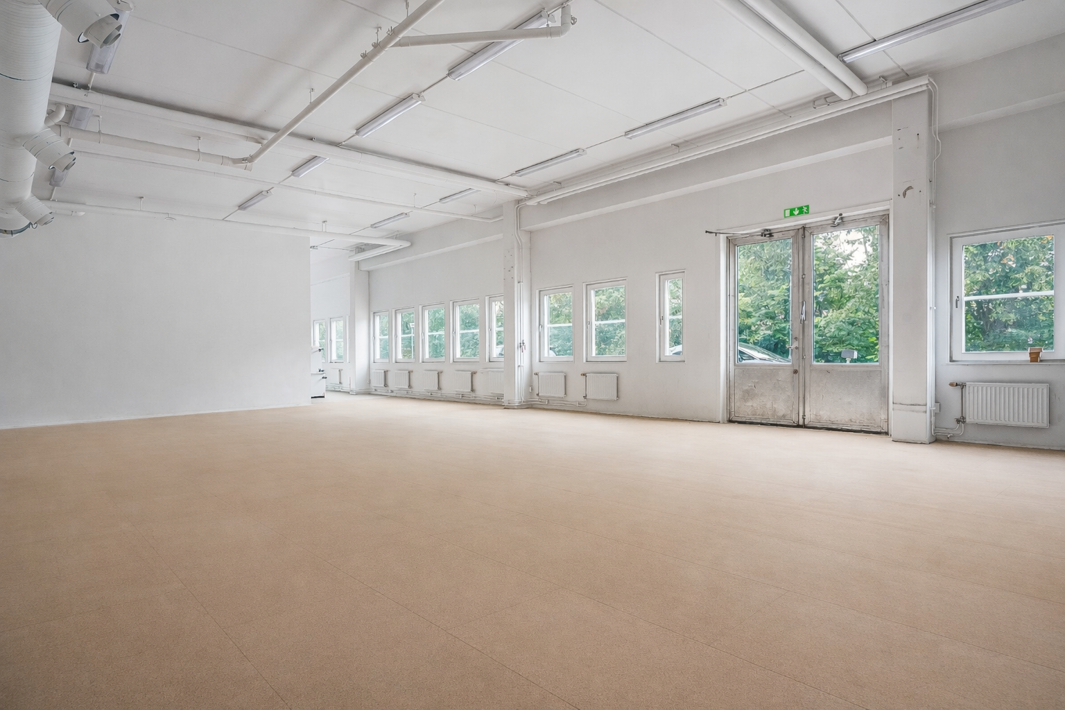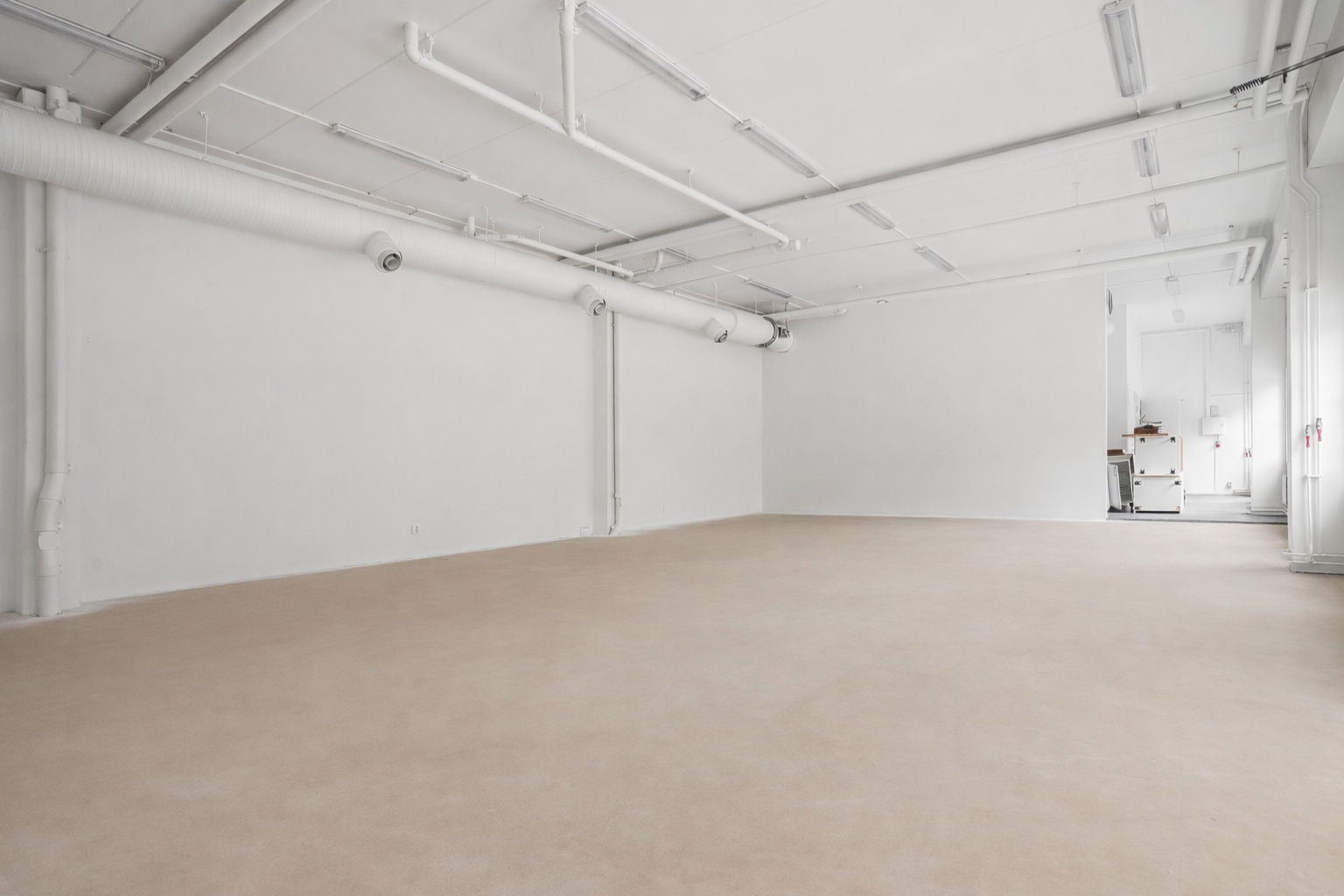 Lokalen har en generös takhöjd och ett härligt ljsuinsläpp tack vare de långa fönsterraderna och fungerar både som kontor med lager eller showroomyta eller enbart som lager.