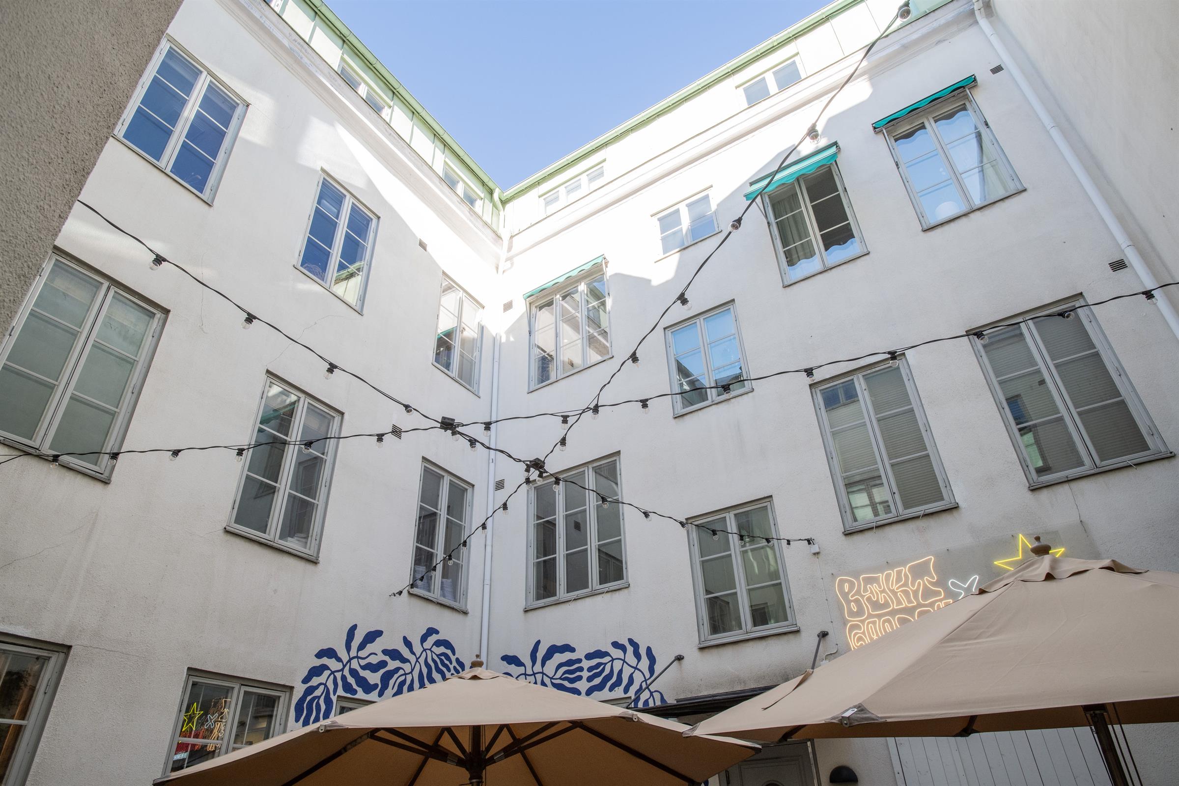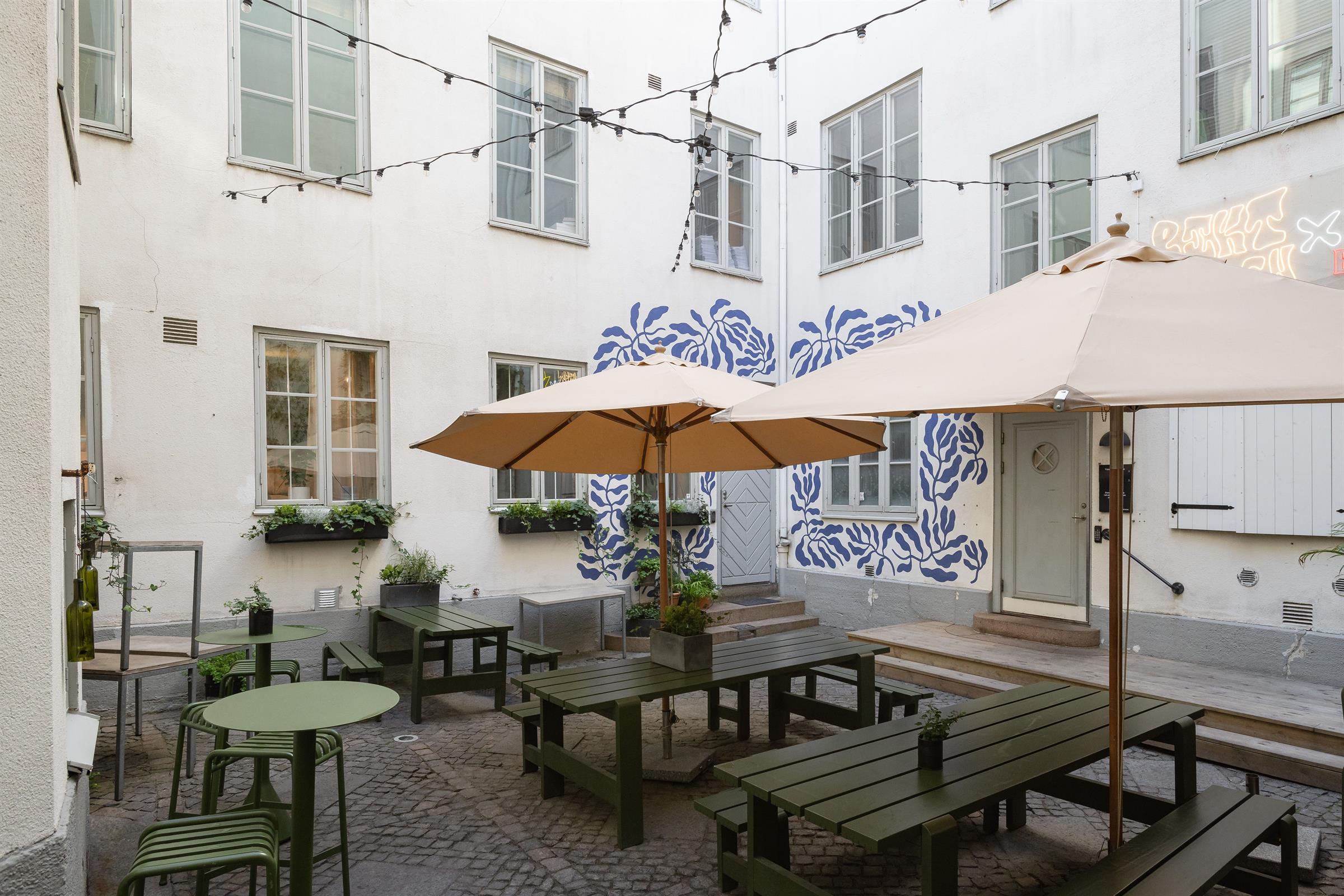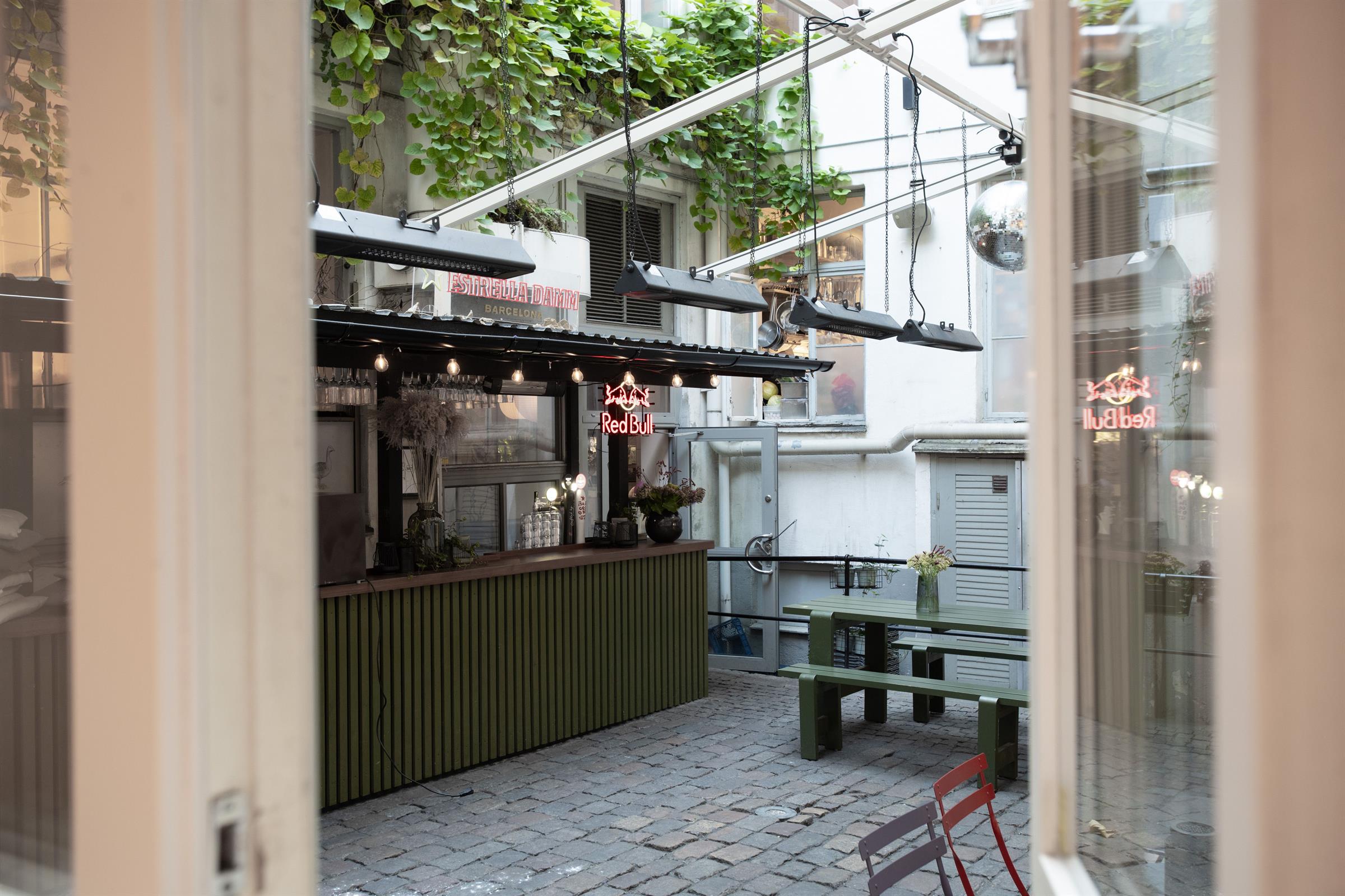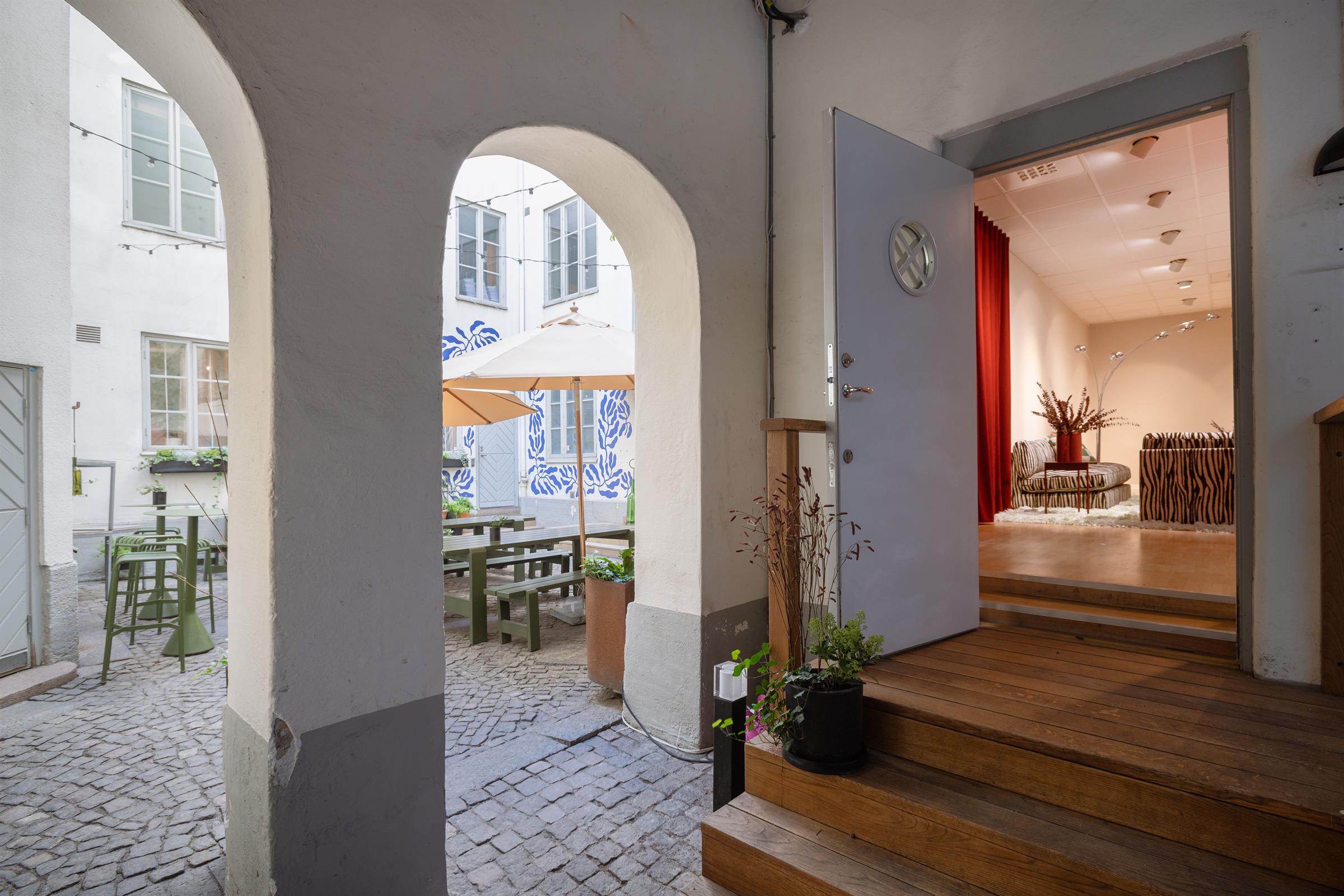 Trots att lokalen ligger mitt i stadens puls, ger den mysiga gården en känsla av lugn och avskildhet, vilket skapar en perfekt balans för en arbetsmiljö som både främjar kreativitet och fokus.