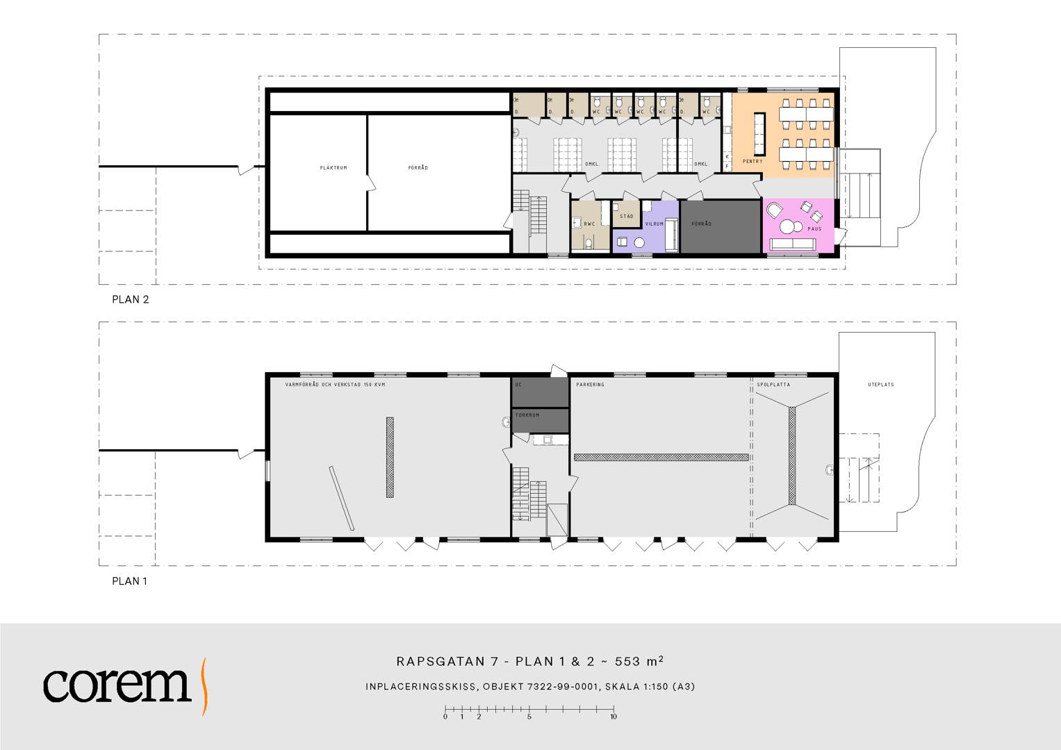 Nedre plan består av verkstad, ett varmförråd, spolhall, torkrum och en uteplats. Här finns både 16 amp uttag och spolplatta med oljeavskiljare. Övre plan består istället av förrådsytor, omklädningsrum, fläktrum och pausrum med pentry. Det bjuder också på goda kontorsmöjligheter.