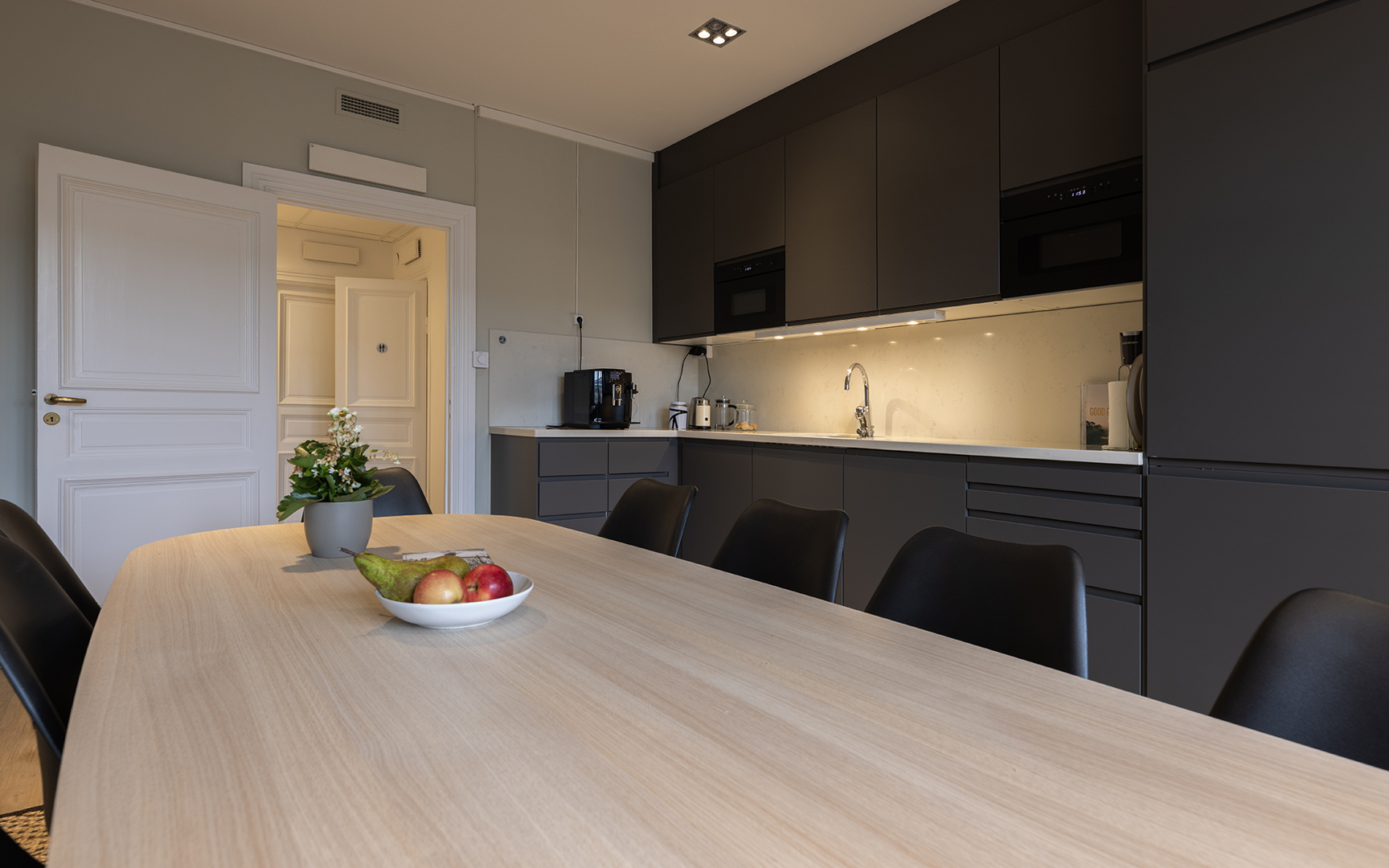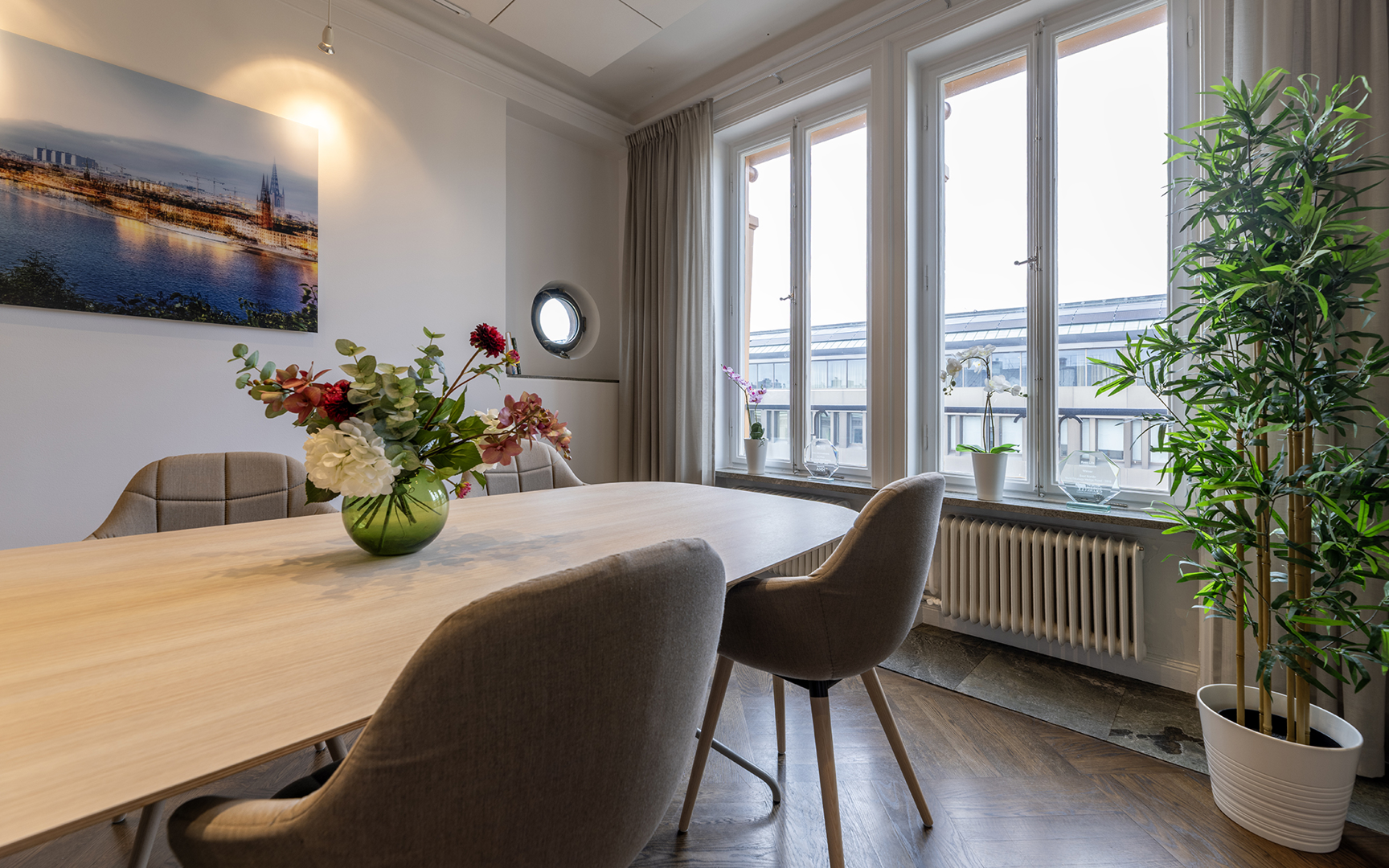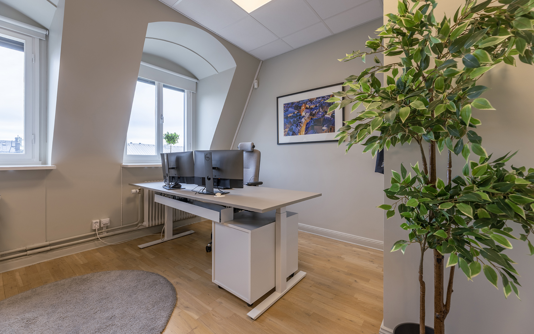 Högst upp i fastigheten erbjuds en unik lokal med sekelskiftesdetaljer, öppna spisar och fiskbensparkett – kombinerat med ett modernt pentry och stilrena färgval. Planlösningen rymmer både privata kontorsrum och ytor för mindre team, samt ett representativt mötesrum som imponerar. Ett kontor som förenar elegans med funktion och ett utmärkt val för företag som prioriterar integritet och vill verka i en exklusiv men anonym omgivning.