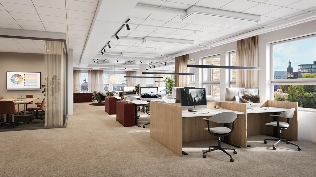 Lokalen erbjuder en egen entré intill byggnadens reception, vilket ger ett trevligt första intryck. Entréplanet om 1 084 kvm utgör en öppen och inbjudande zon där besökare möts av loungemiljöer och flexibla arbetsytor. En takhöjd om över fyra meter, i kombination med stora fönsterpartier mot Karlbergskanalen, skapar en ljus och luftig atmosfär. Via intern förbindelse nås våning 1 som omfattar hela 4 661 kvm. Här finns goda möjligheter att utforma moderna kontorsmiljöer anpassade efter organisationens behov. För verksamheter med större ytbehov kan våning 2, om ytterligare 4 679 kvm, kopplas samman med de nedre planen och skapa en samlad arbetsplats om drygt 10 000 kvm. Lokalens generösa terrasser med utsikt över Karlbergskanalen är en unik tillgång och lämpar sig väl för till exempel pauser, kreativa möten eller mingel.