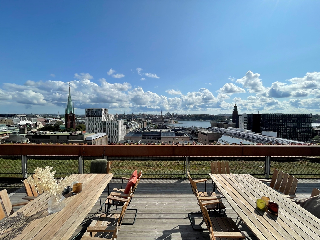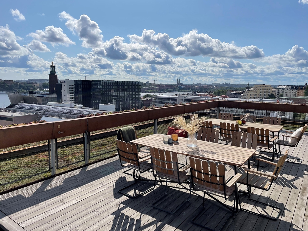 Högst upp finner ni en exklusiv takterrass för alla hyresgäster. Här har man en magisk utsikt över Stockholms landmärken och takåsar, en perfekt plats för kreativa möten, events, afterwork och härliga pauser i solen.