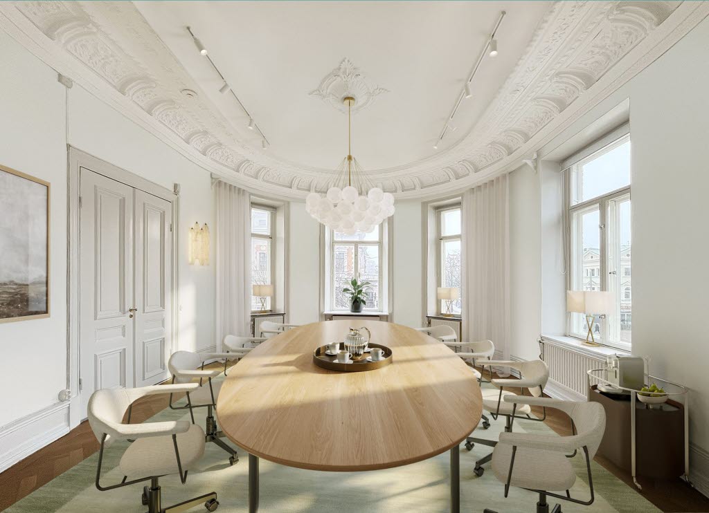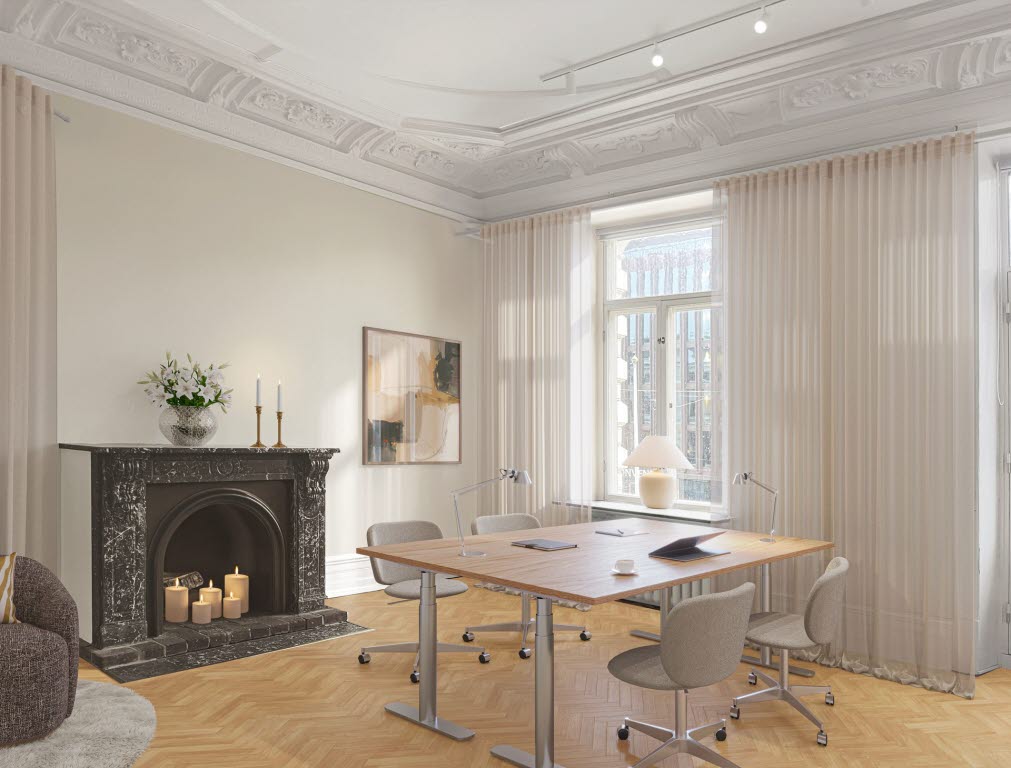 Ytskikten kommer varsamt att renoveras, med stor respekt för lokalens ursprungliga karaktär. Resultatet blir en harmonisk kombination av klassiska detaljer och moderna materialval som stödjer en funktionell och inspirerande arbetsmiljö.