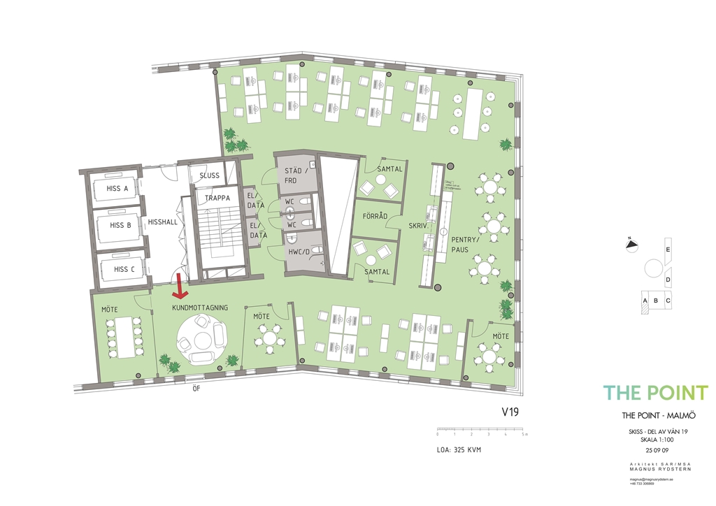 Högt upp på våning 19 i The Point hittar ni denna ljusa och rymliga kontorslokal om 325 kvm, med en utsikt över Öresundsbron som garanterat imponerar på både medarbetare och besökare. Här kombineras generösa ytor med smart planering för att skapa en arbetsmiljö där både fokus och samarbete får ta plats. Lokalen erbjuder tre välutrustade mötesrum och två mindre samtalsrum för avskilda diskussioner. I det öppna kontorslandskapet finns plats för upp till 20 personer, perfekt för er som vill arbeta nära varandra men ändå ha gott om svängrum. Vid entrén kan ni skapa en inbjudande reception eller lounge, en naturlig samlingspunkt för både kunder och kollegor. Självklart är lokalen utrustad med moderna bekvämligheter som toaletter och RWC med dusch, för en både praktisk och trivsam arbetsplats.