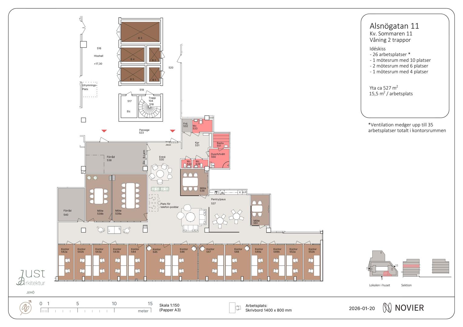 Går att hyra för 1 500 kr/plats/månad. Kvot: 1 plats per ca 150 kvm hyrd yta.