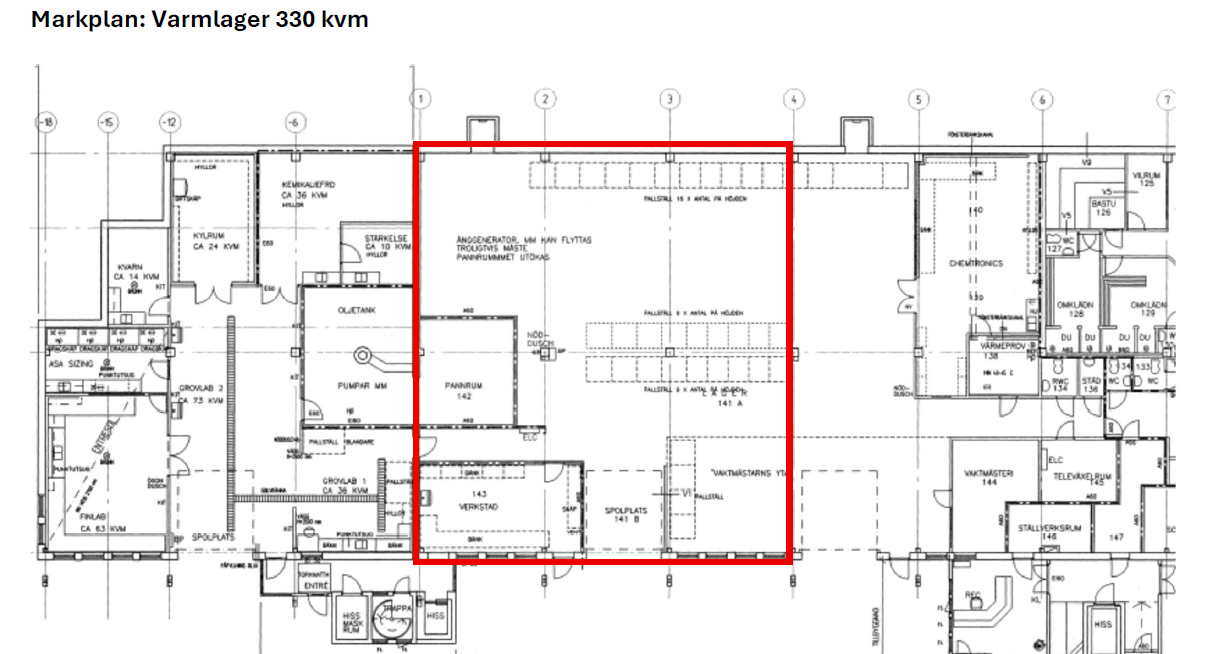 Varmlager i markplan på ca 330 kvm, takhöjd ca 5 m och port på 4,5x 3,6 m. Praktiska ytor för lager, pentry och wc.