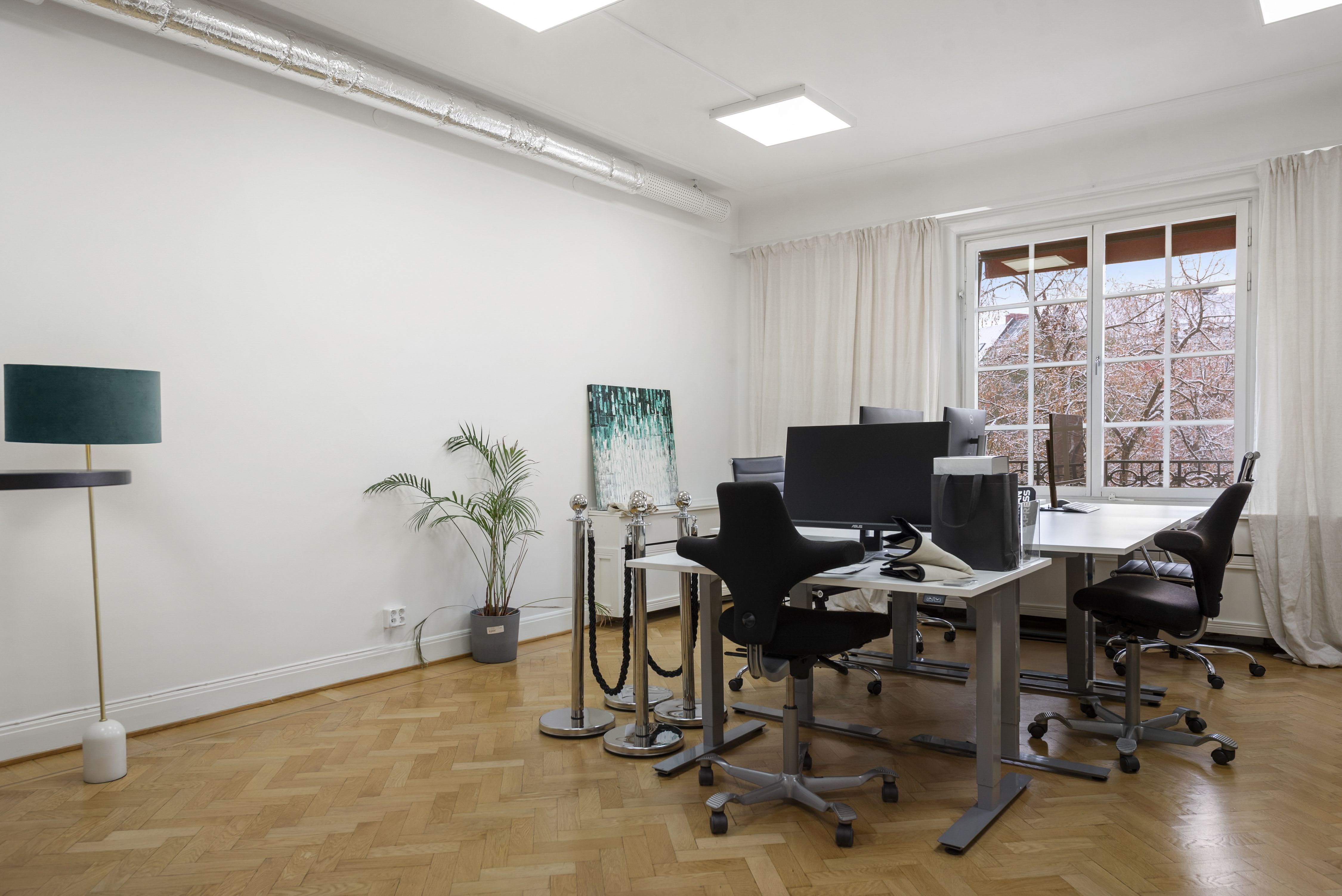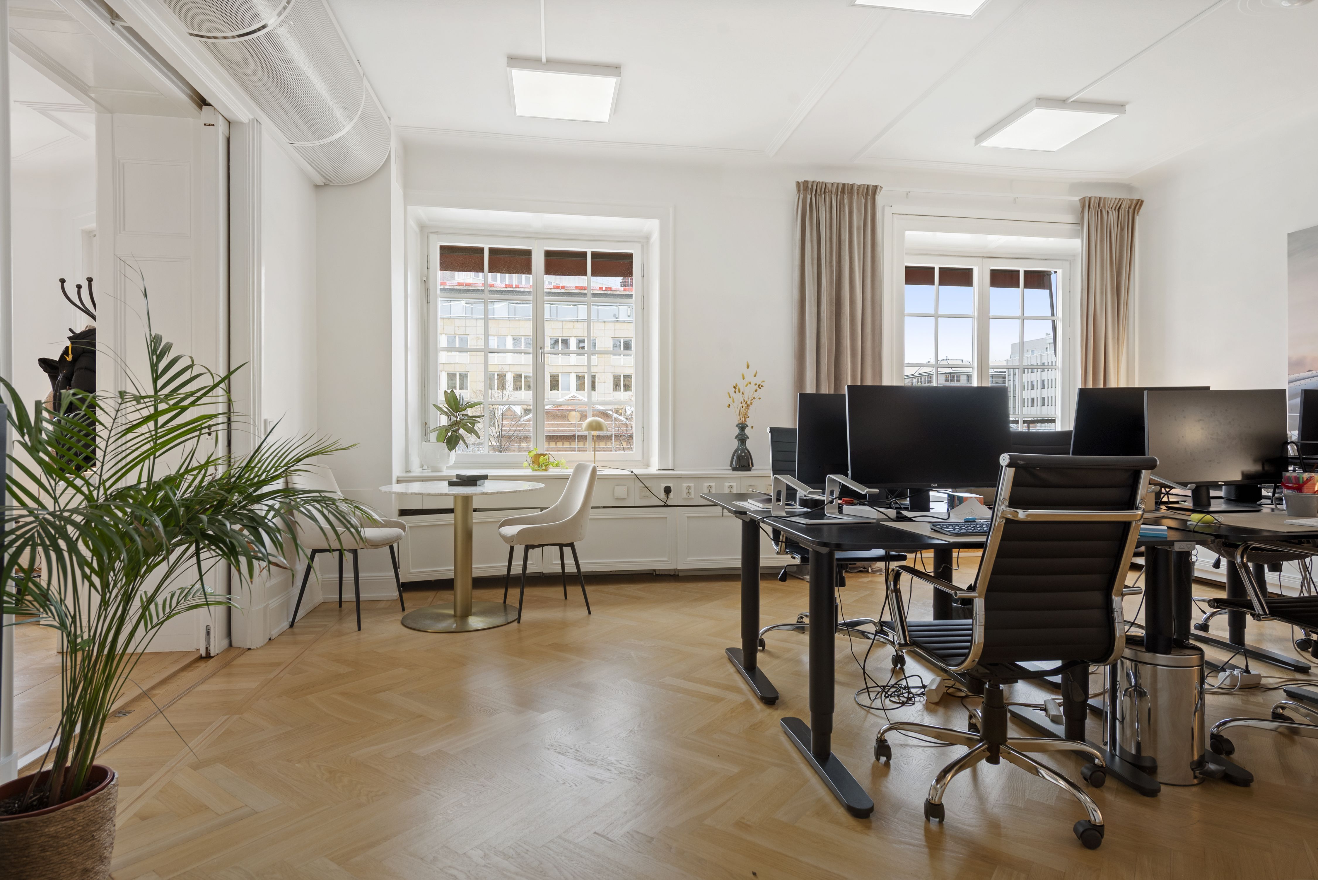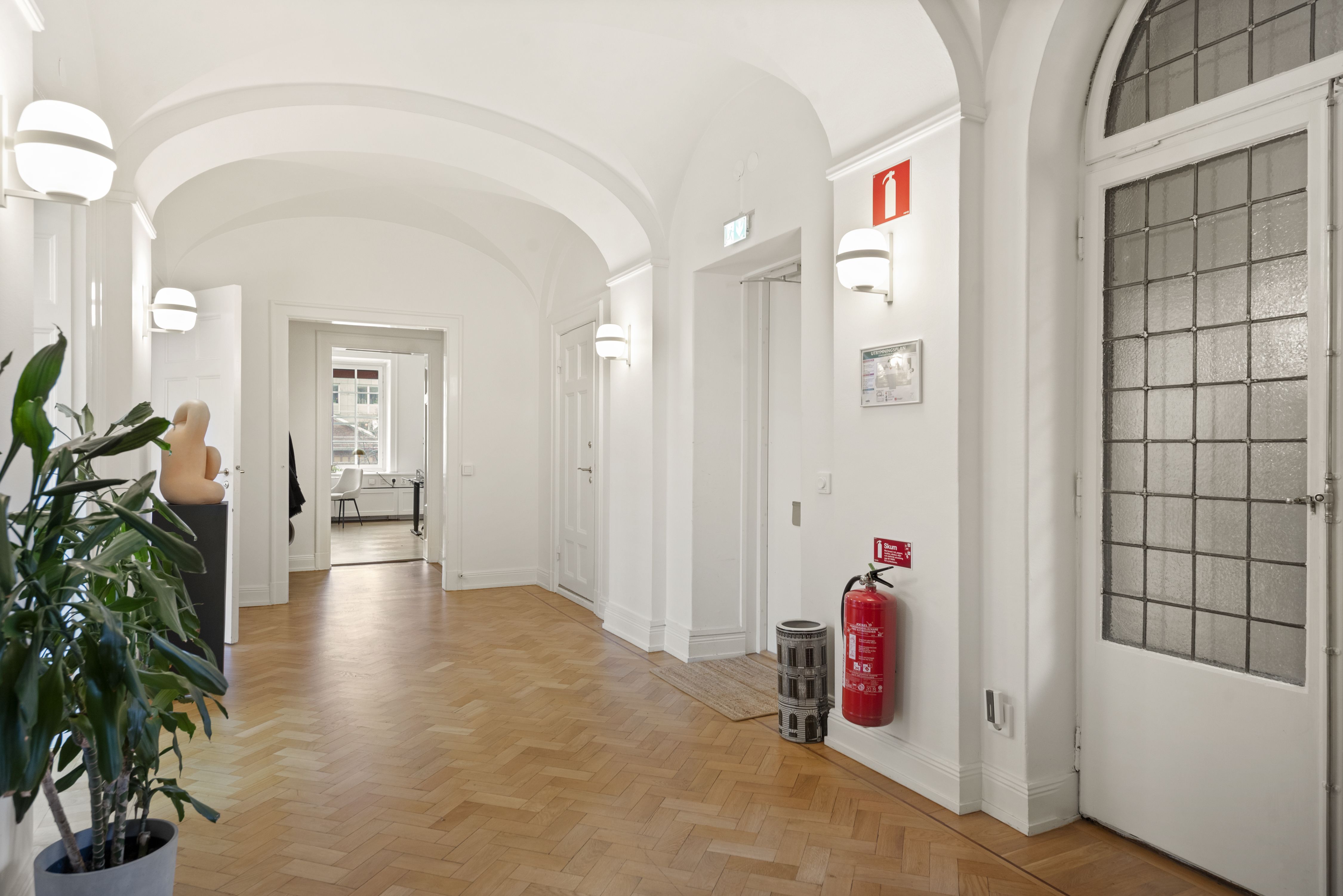 Direkt vid entrén möts du av en luft mottagande yta med välvda tak. WC intill entré samt passande ytor för mötesrum intill. Lokalen har genomgående ett par större rum i fil ut mot Birger Jarlsgatan/Eriksbergsgatan med 3 balkonger totalt.