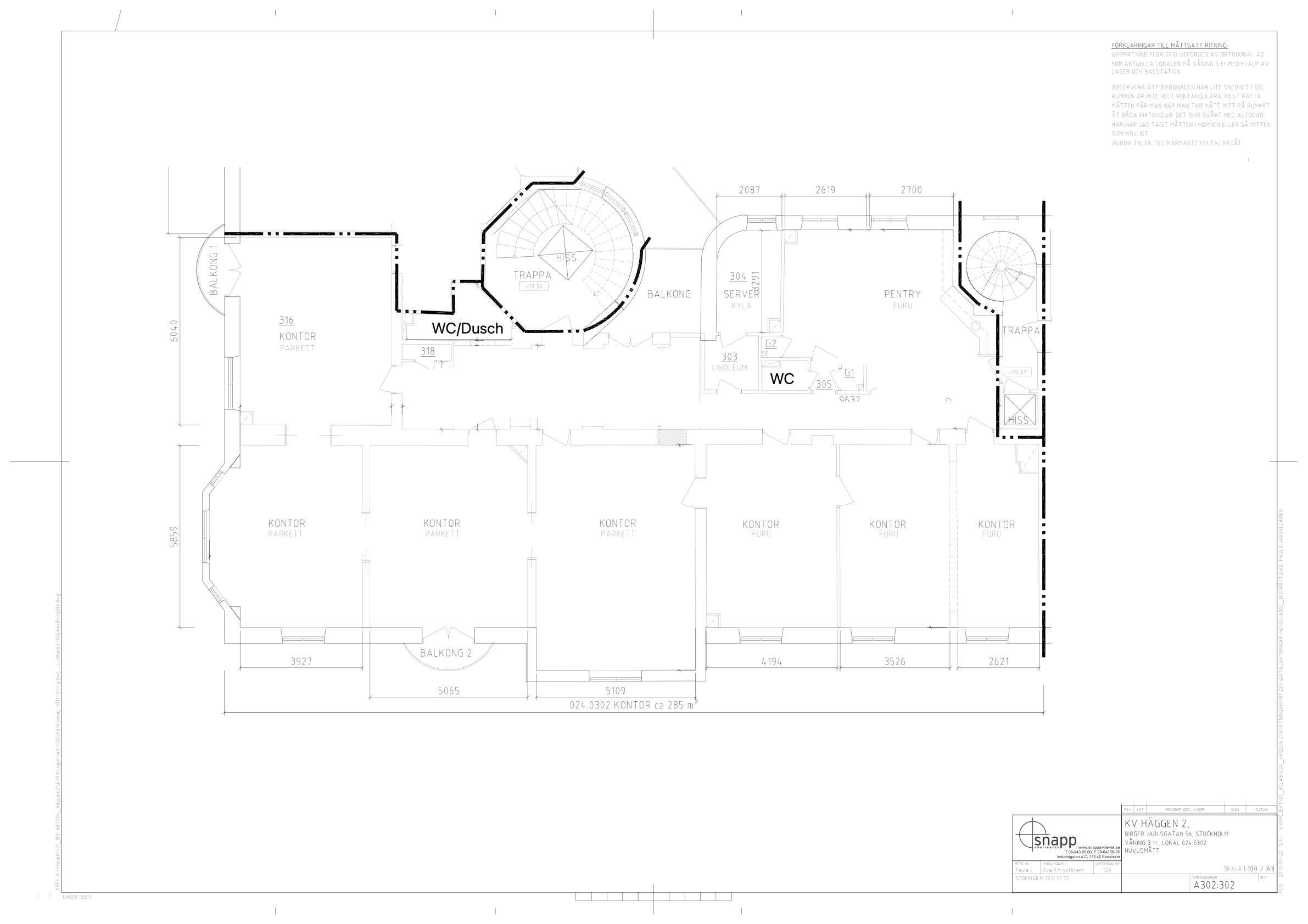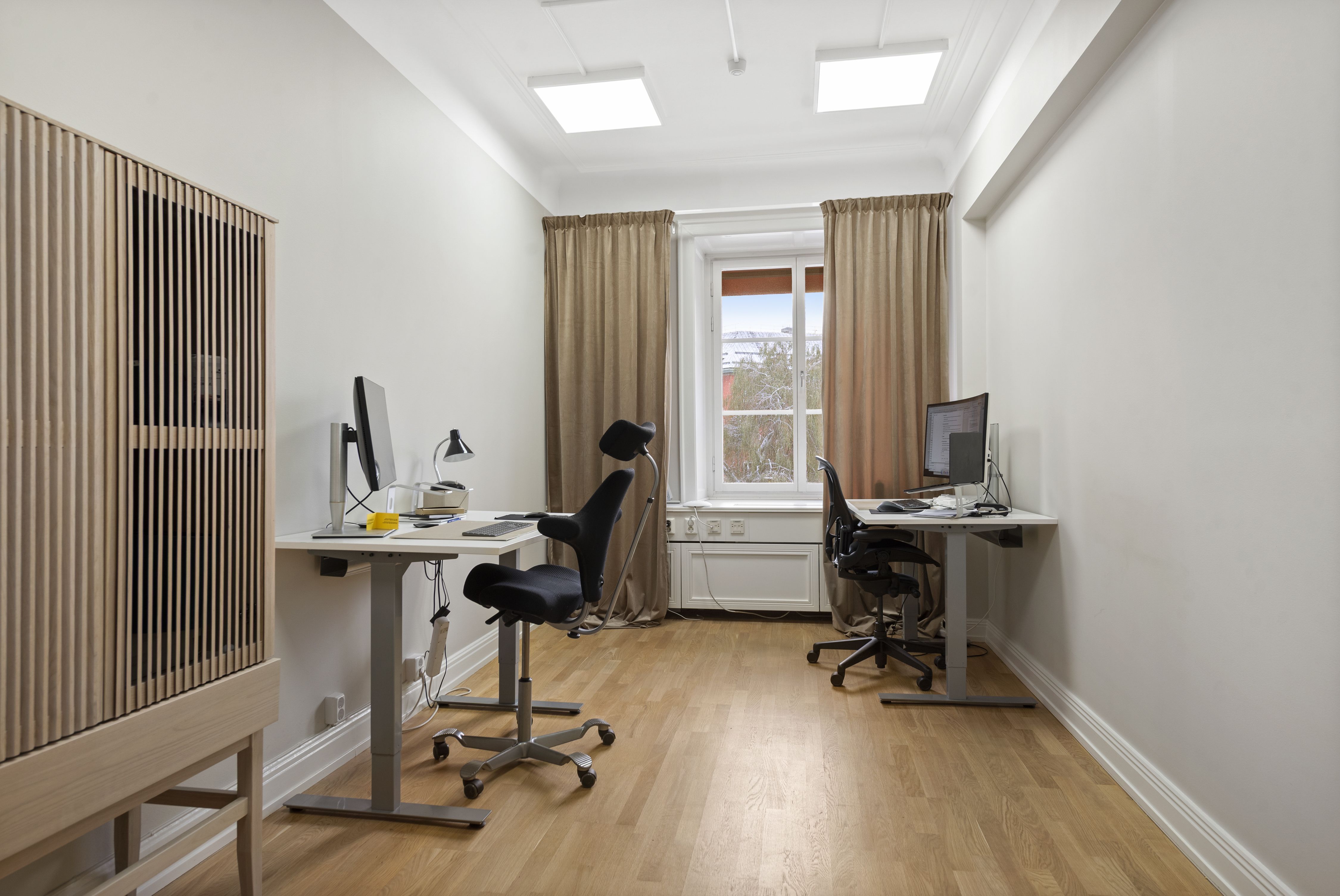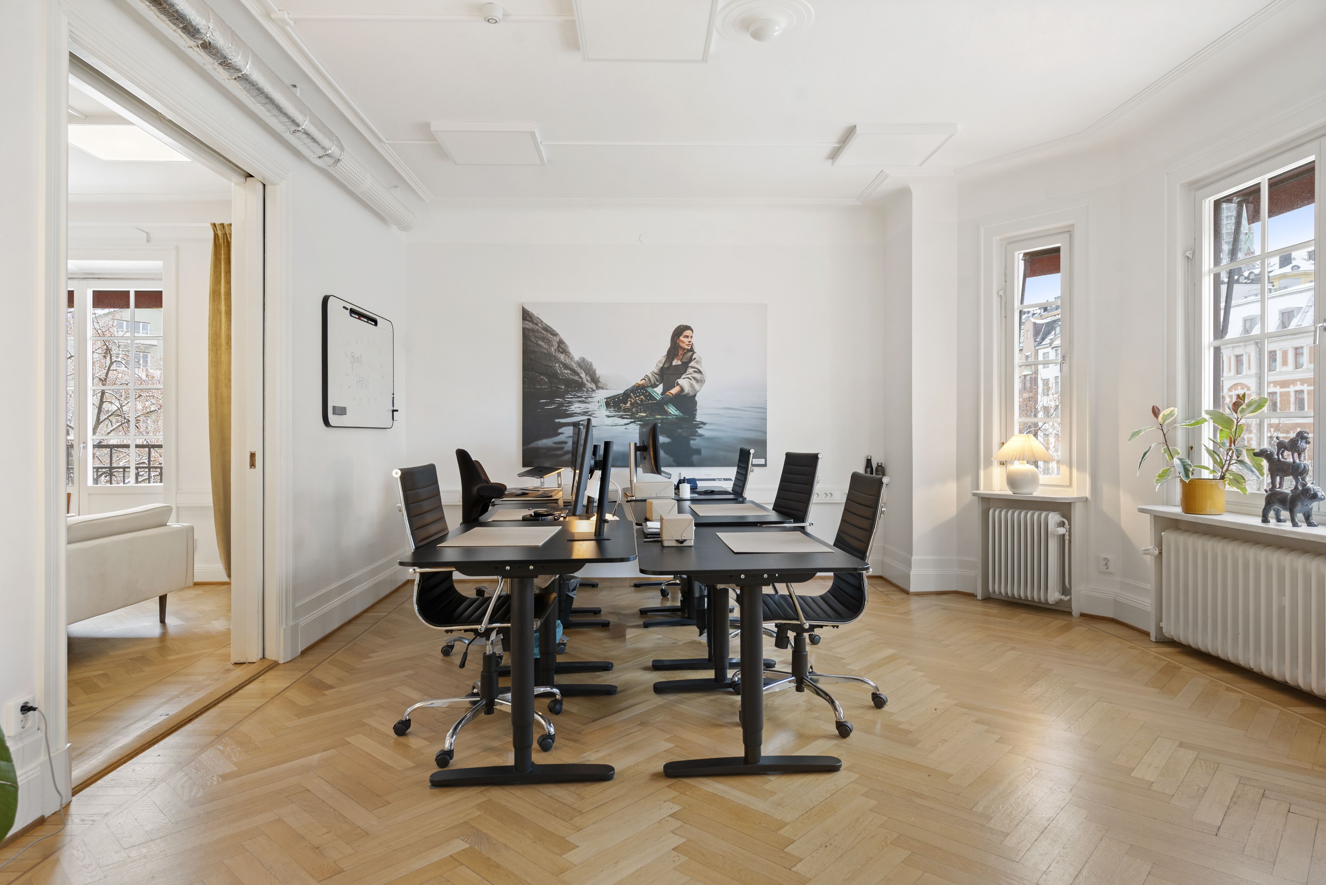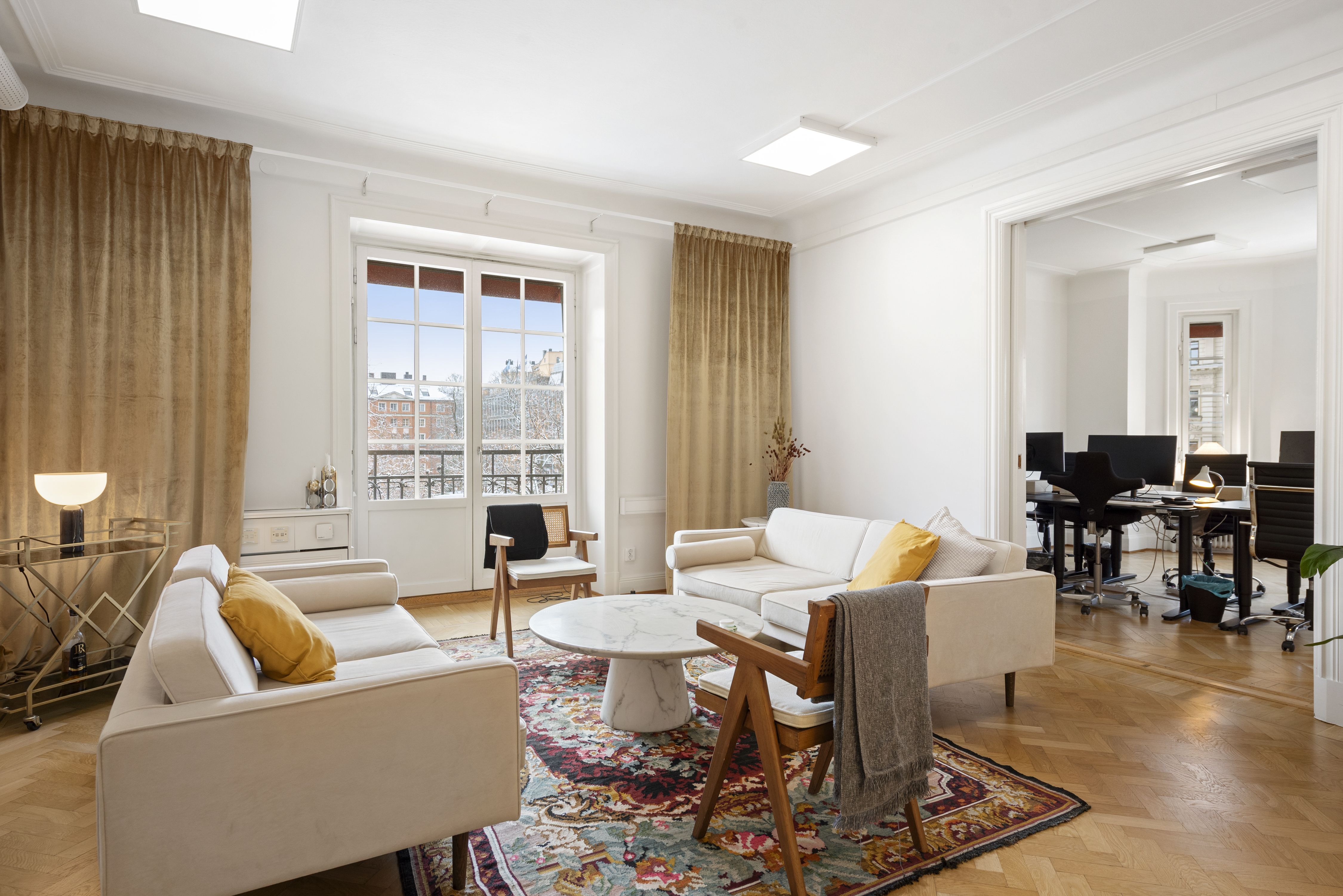 Direkt vid entrén möts du av en luft mottagande yta med välvda tak. WC intill entré samt passande ytor för mötesrum intill. Lokalen har genomgående ett par större rum i fil ut mot Birger Jarlsgatan/Eriksbergsgatan med 3 balkonger totalt.