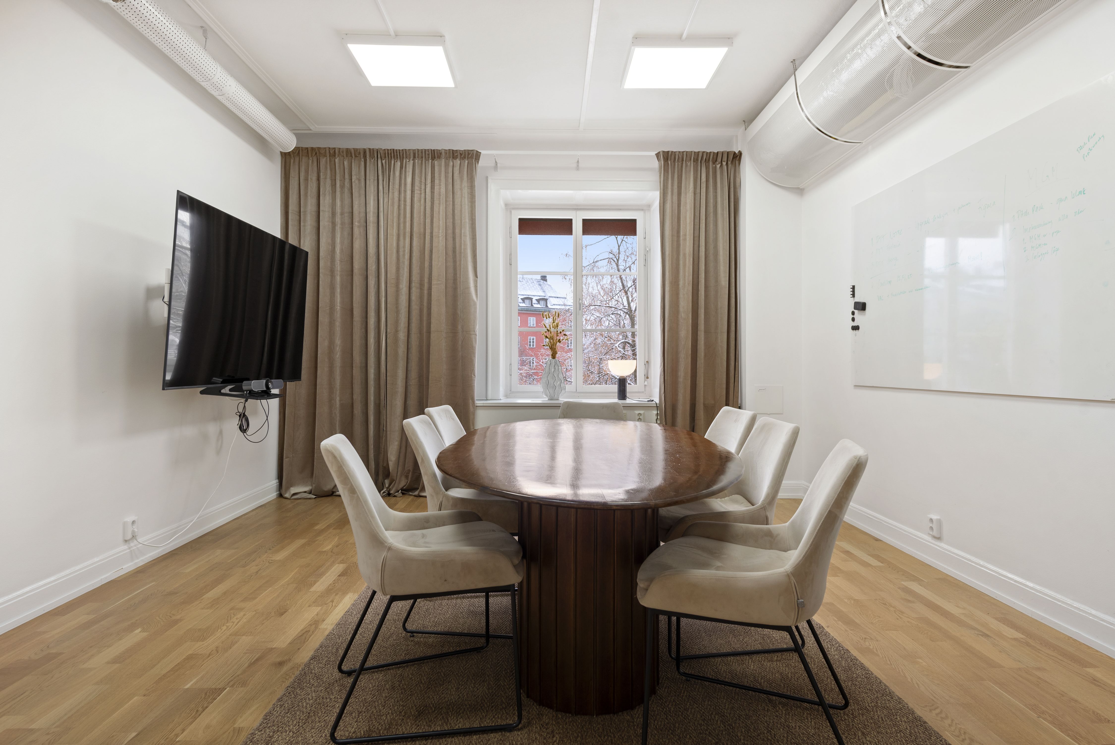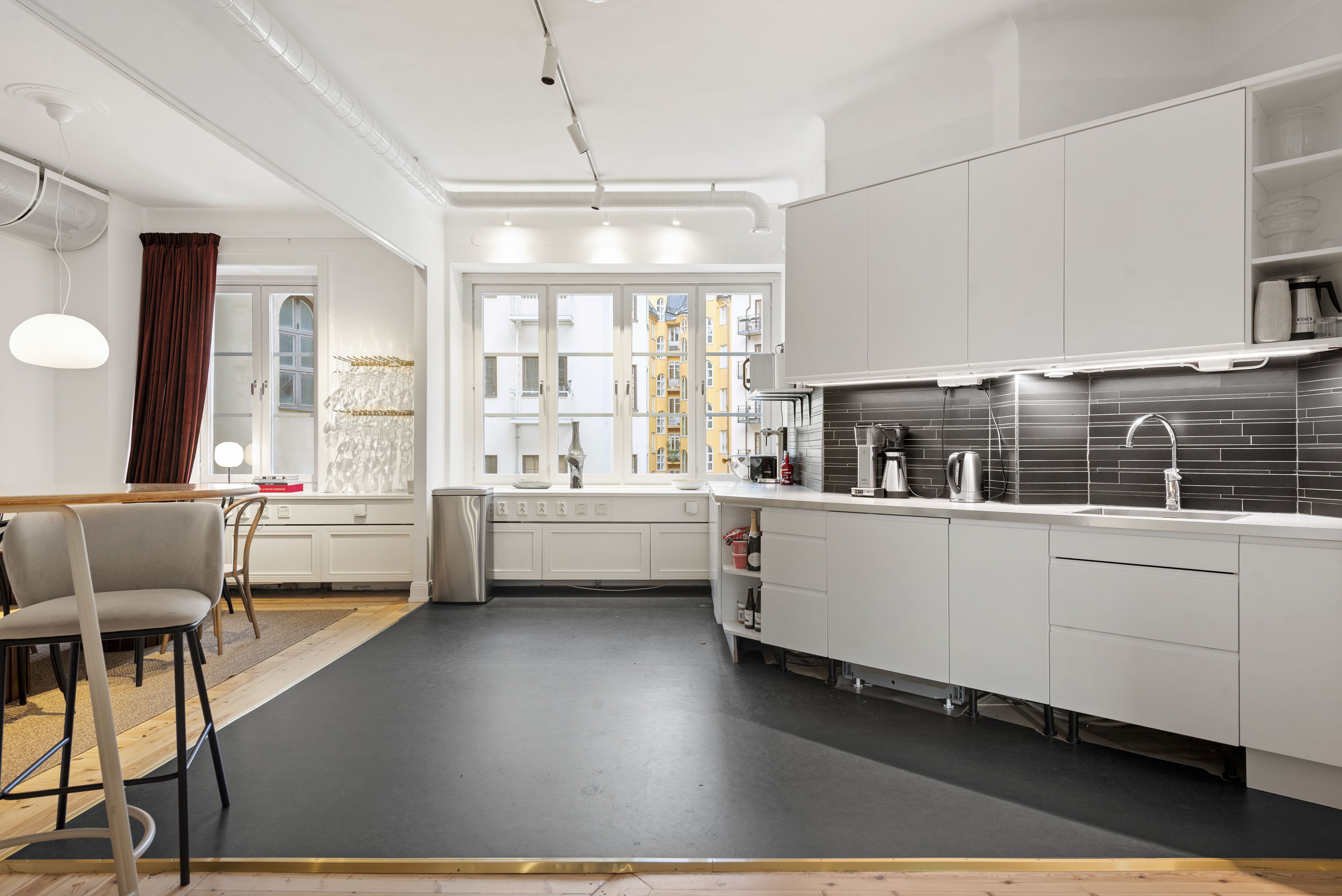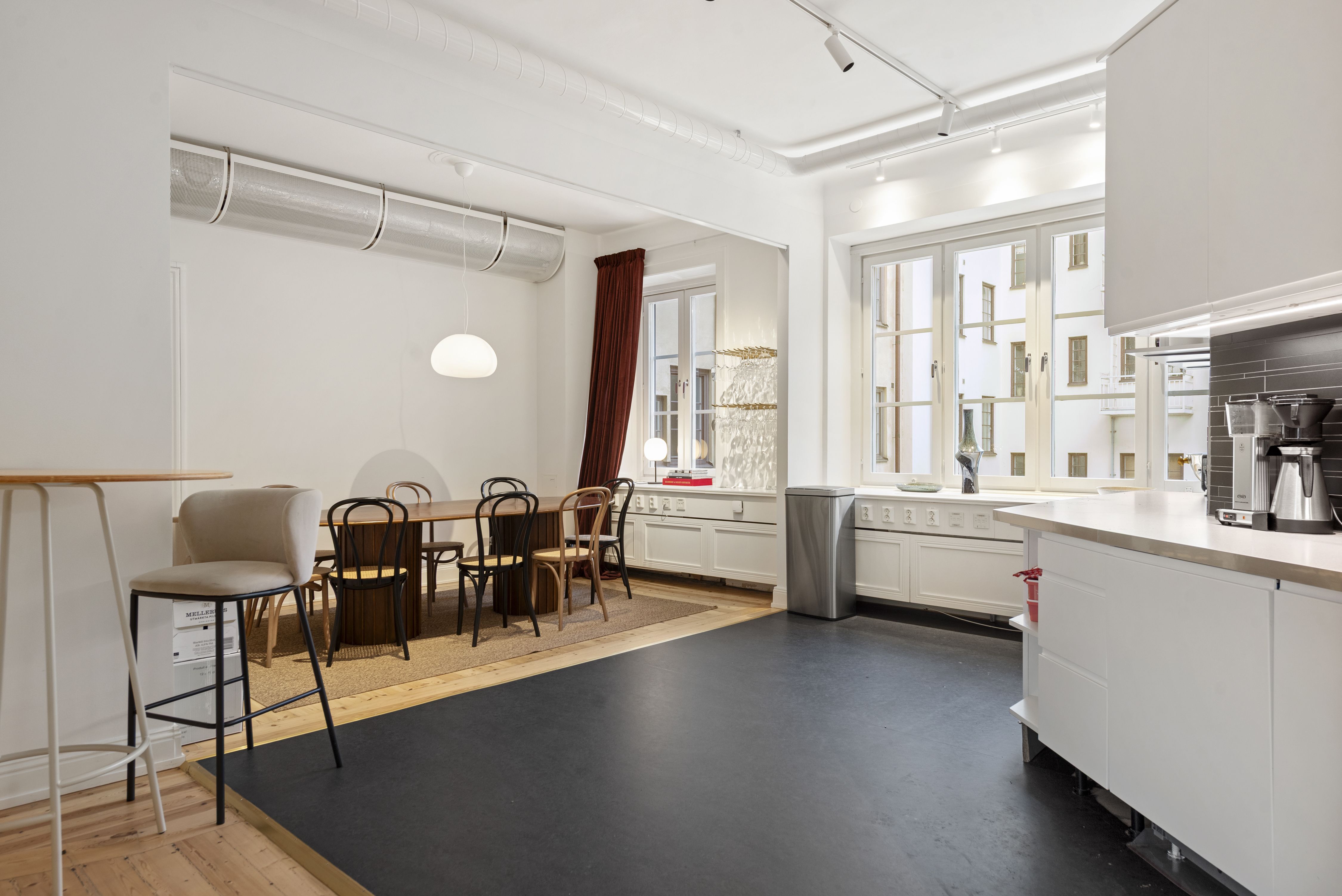 Ett större pentry med fantastiska fönster mot fastighetens innergård, perfekt för en avskild och social yta.